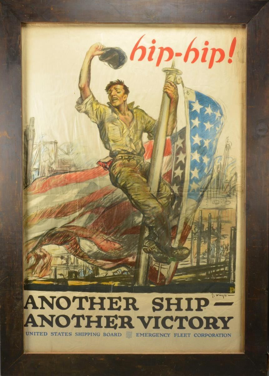 Poster depicts a ship yard worker clinging to a flag pole yelling, “hip-hip” w/ a ship yard scene in the background. Poster’s frame measures 47" x 65 1/2". The bottom of the poster reads, “ANOTHER SHIP – ANOTHER VICTORY” & “UNITED STATES SHIPPING BOARD EMERGENCY FLEET CORPORATION ISSUED BY PUBLICATION SECTION EMERGENCY FLEET CORPORATION PHILADELPHIA PA”. The United States Shipping Board was created in 1916 by the Shipping Act & the program was ended in 1934. CONDITION: poster appears to have been quarter folded & has some scattered edge tears. Poster has not been examined out of frame. (02-14901/BF). $300-400.