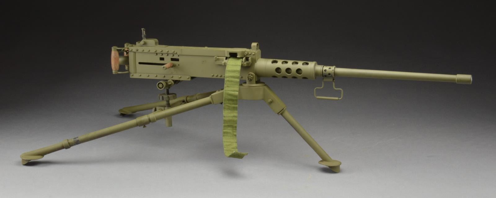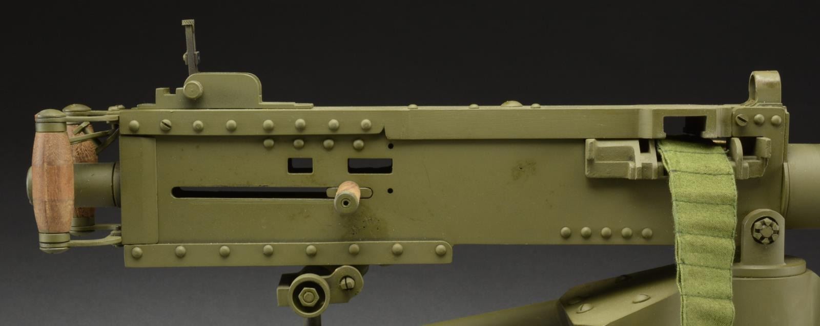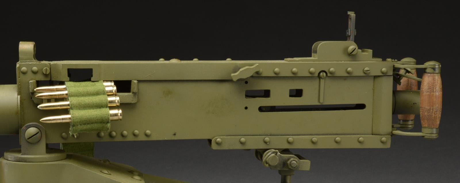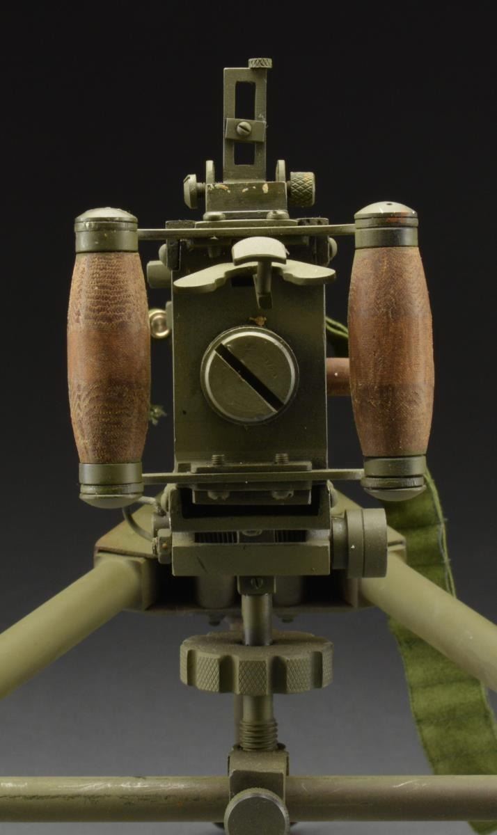 MOUNT TRIPOD. Very nicely detailed model of 50 cal. machine gun. Gun measures 30 1/2" long. Tripod measures 26 1/4" overall in extended position. Entire model measures 36 1/2" long, 17 1/2" wide & 10 1/2" tall. Many moveable features including triggers, rear sight, bbl. carrying handle, T&E mechanism. Tripod folds correctly. Model is finished in attractive OD green paint w/ wooden grips. Wooden bolt handle which reciprocates. Feed cover is not designed to be opened. UNATTACHED ACCESSORIES: includes approx. 14" cloth belt w/ 4 dummy lathe turned steel cartridges. CONDITION: painted finish has light high point wear, scattered scratches & a few scattered spots of white paint. (02-14753/RW). $600-1,200.