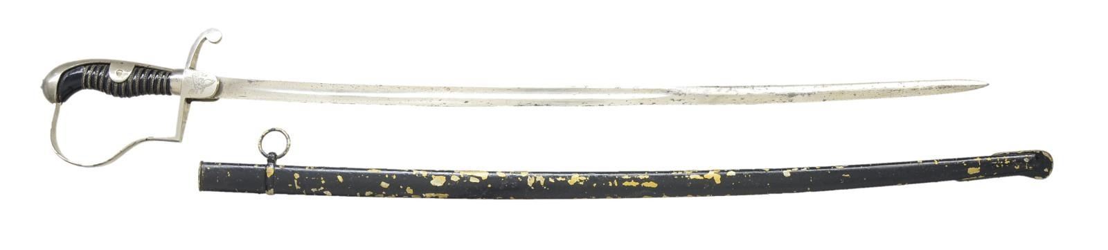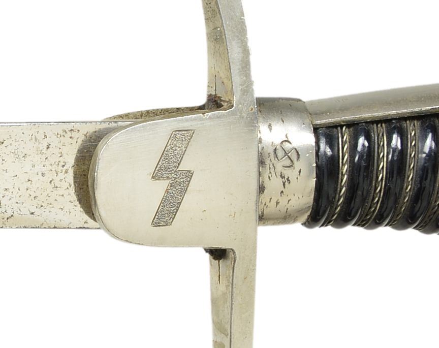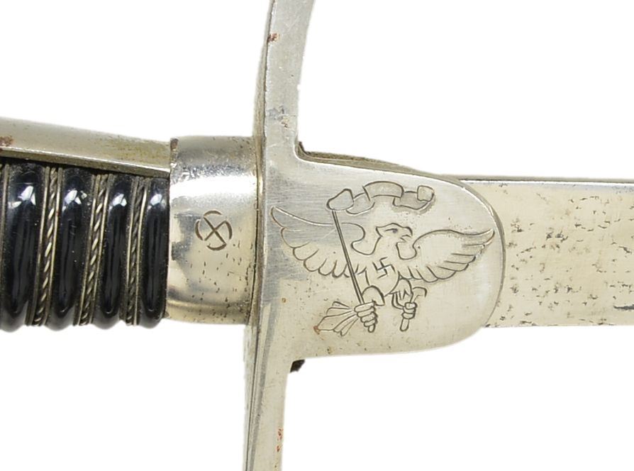 Overall length: 32 1/4". Blade length: 25 1/2". Unmarked single fuller blade. Plated iron grip w/ German Youth eagle engraved on 1 languet & a German Youth rune on the other languet. There are 2 mobile Party symbols engraved on the ferrule. Plain backstrap, knuckle bow & dove head pommel. Black composite wire wrapped grip. Black painted scabbard. An interesting youth size sword w/ engraving that appears to have been done in the period though we encourage you to inspect this sword in person. CONDITION: blade has some dark discoloration, particularly near the tip. Hilt shows light wear overall. Scabbard appears to have been originally nickeled, then painted gold & then painted black. (02-15182/BF). $400-600.