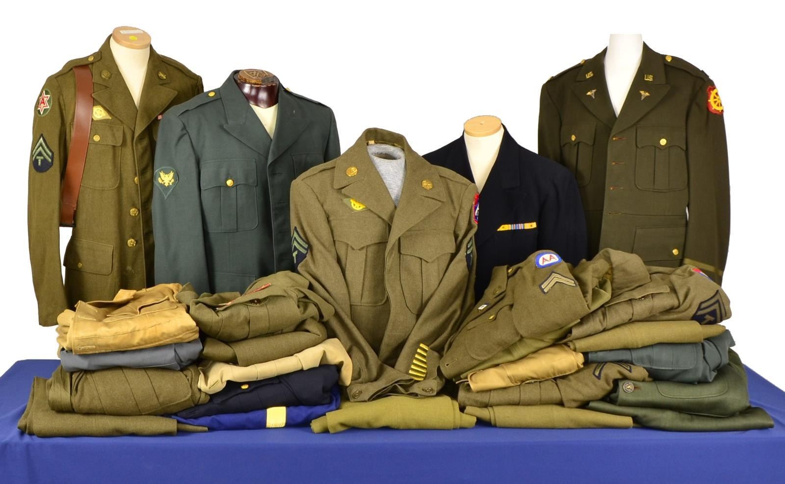 This group includes a WWII Infantry Ike jacket for a Corporal w/ pants. / WWII uniform coat for a Corporal in the Air Corps & pants. / Army officers uniform for a member of the 2nd Division. / WWII Navy Lieutenant Commanders uniform & pants. / WWII Navy Lieutenant Commander green uniform & pants. / WWII Army uniform for a Technical Corporal in the Coast Artillery. / Army Specialist uniform for a member of the Signal Corps. / Army dress uniform & pants for a Warrant Officer. / WWII Army Ike jacket for a Technical Corporal w/ pants & hat. / WWII overcoat for a Sergeant. / Navy Lieutenant green WWII uniform & pants. / 2 Navy khaki uniform coats. / Navy green uniform coat for an Ensign. / Army WWII officer’s khaki tunic & pants. / WWII Ike jacket for a Sergeant in the Liberty Division. / Captain’s uniform & belt for the Dental Corps. / WWII Ike jacket for a Private w/ pants. / WWII Ike jacket w/ pants for a Technical Corporal. CONDITION: uniforms & associated items show light to moderate wear except as noted. (02-14469/BF). $700-1,000.