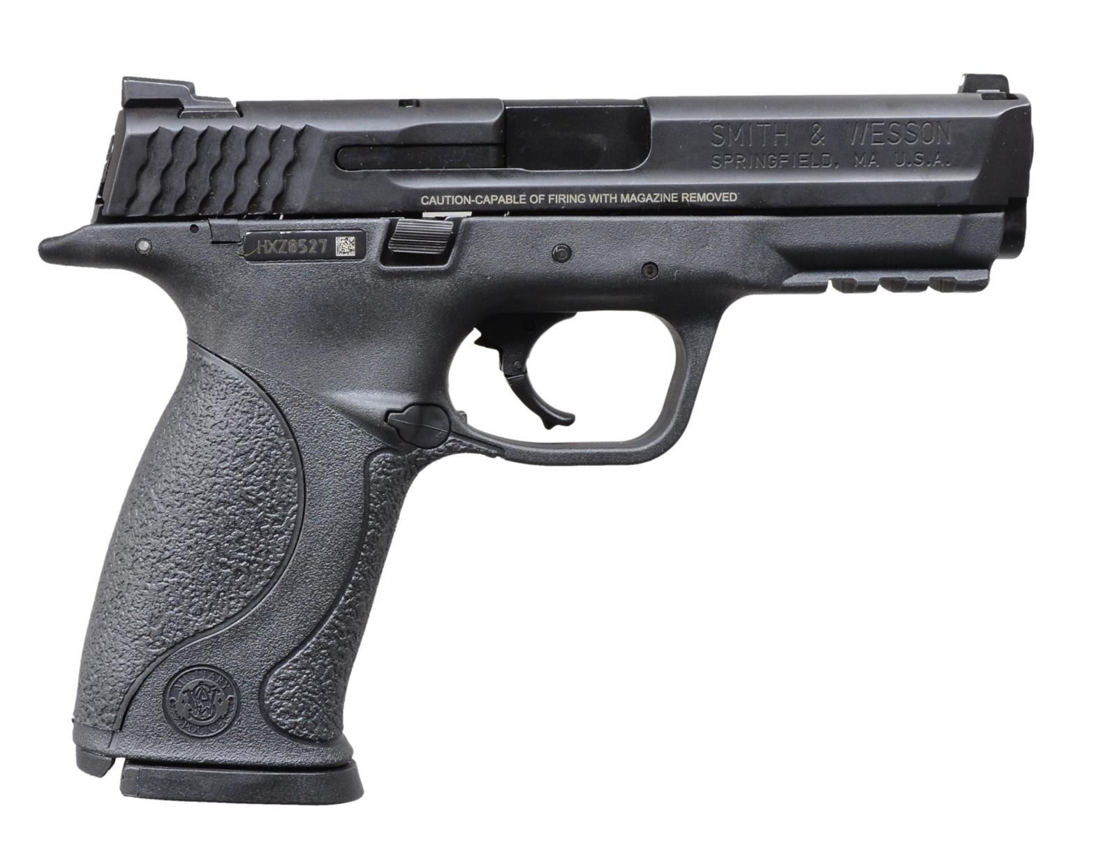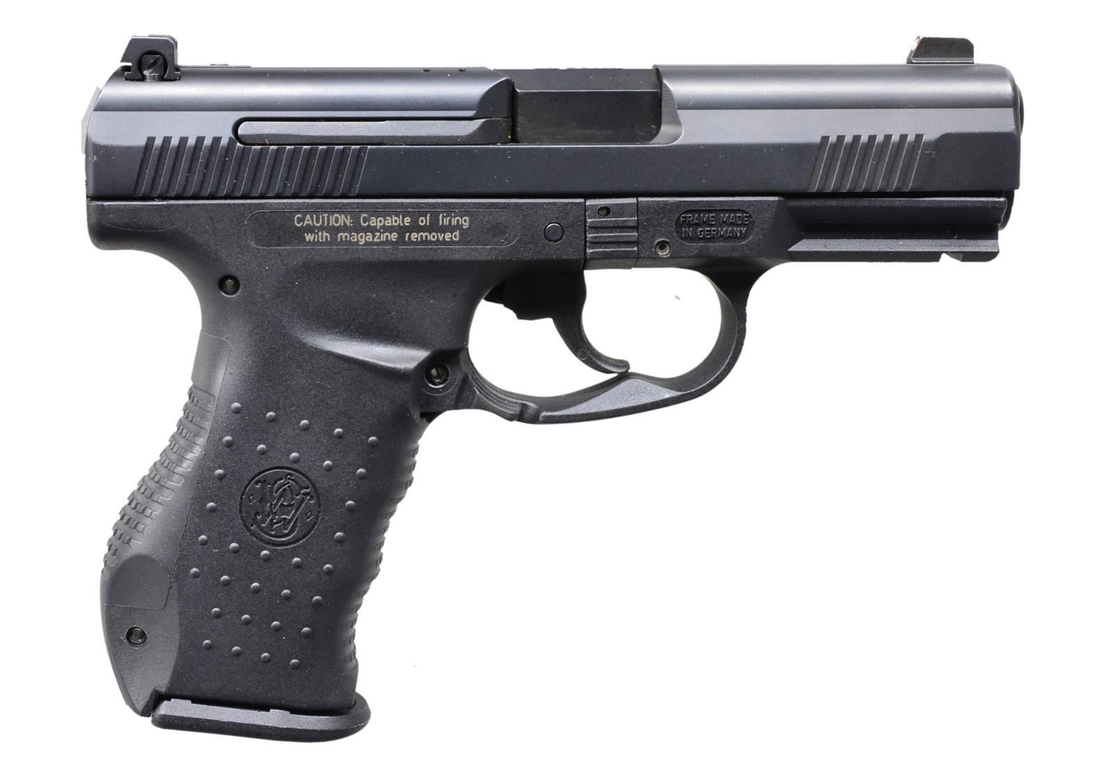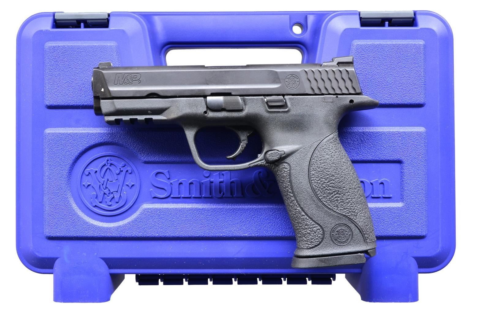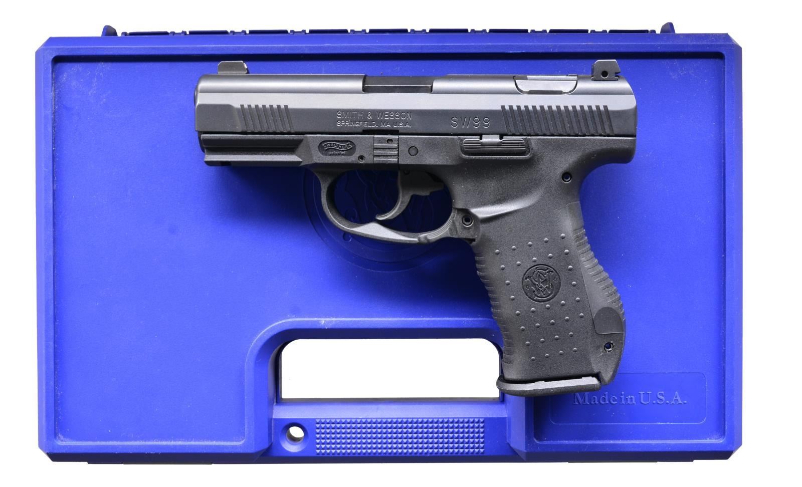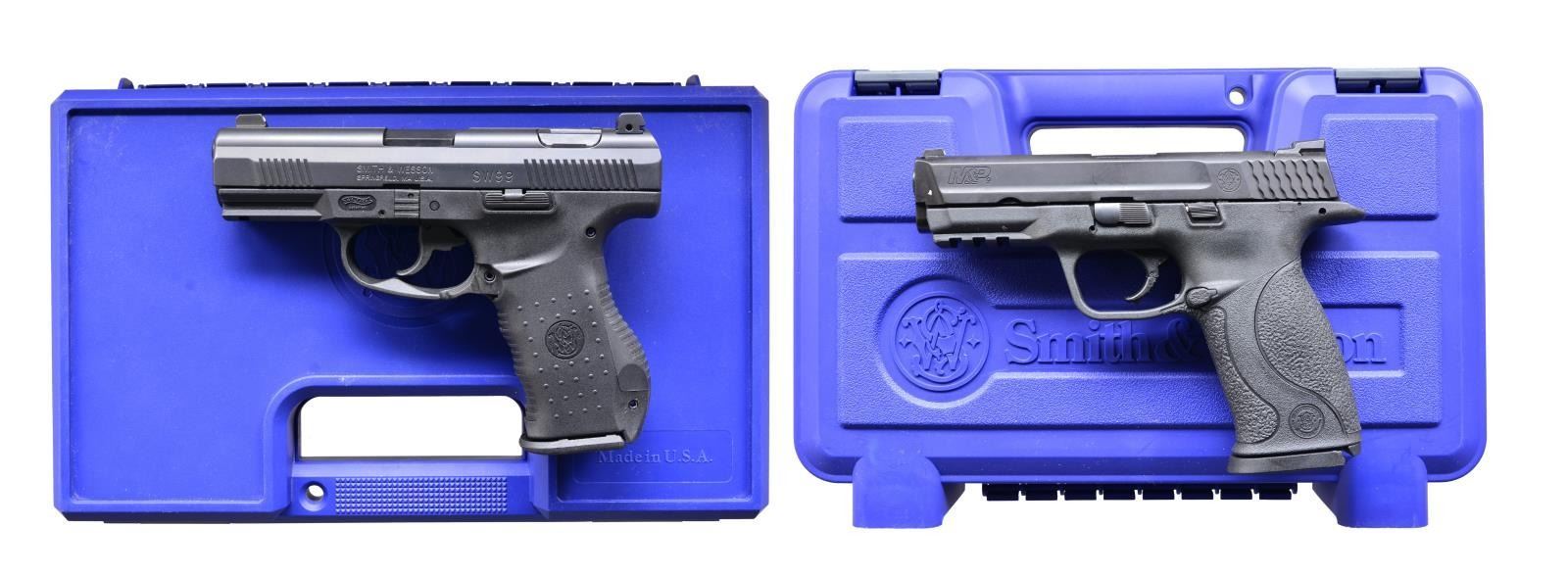1) SW99. Cal. 40 S&W. S# SAJ0594. Bbl. 4 1/8". Matte black finished stainless steel slide w/ 3 dot night sights. Black finished frame w/ bottom accessory rail & interchangeable backstraps. Mfg. 2000-2004. MAGS: 4 detachable 12 rd. UNATTACHED ACCESSORIES: molded blue box w/ matching numbered label containing mags., 2 interchangeable back straps, trigger lock & original 3 dot sights. CONDITION: over 98% finish. Bright near excellent bore. (21-859/DS). 2) M&P 9. Cal. 9mm L. S# HXZ8527. Bbl. 4 1/4". Stainless steel slide & bbl. w/ black Melonite finish. 3 Dot sights. Full size polymer frame w/ accessory rail & interchangeable backstraps. MAGS: 2 detachable 16 rd. UNATTACHED ACCESSORIES: blue box w/ matching label containing mags., 2 interchangeable backstraps, instruction manual, registration card & trigger lock. CONDITION: over 98% finish. Bore retains strong rifling. (21-861/DS). BOTH MODERN. $800-1,100.