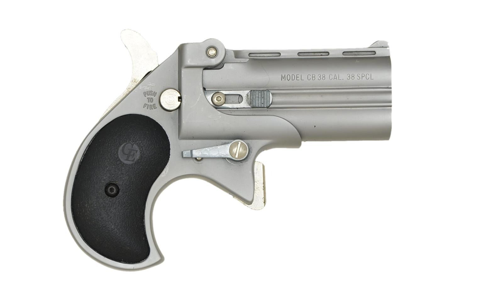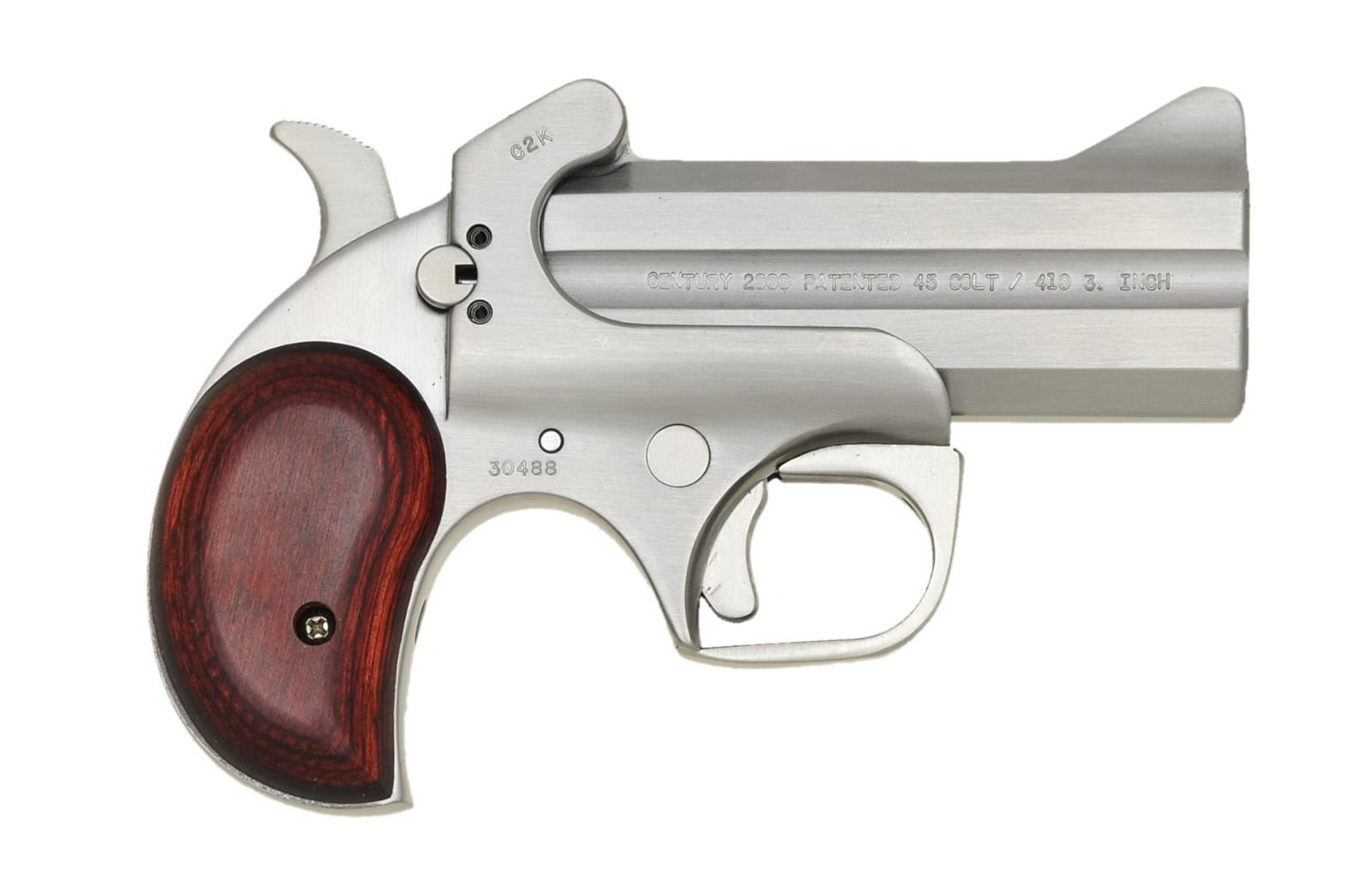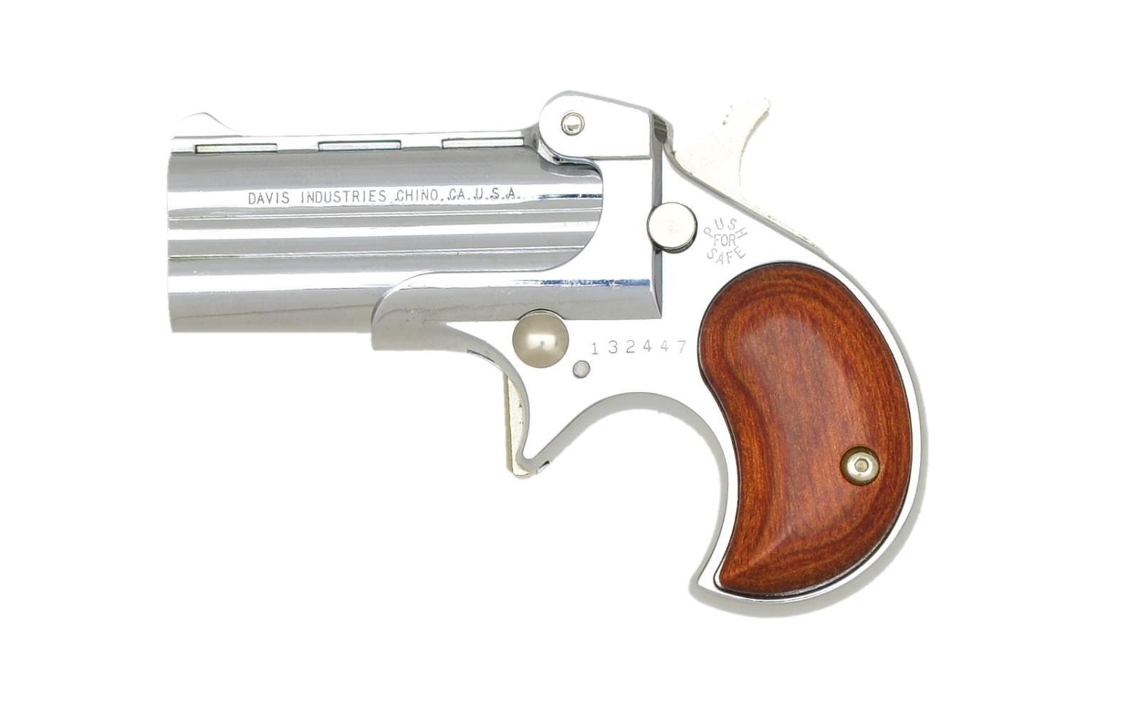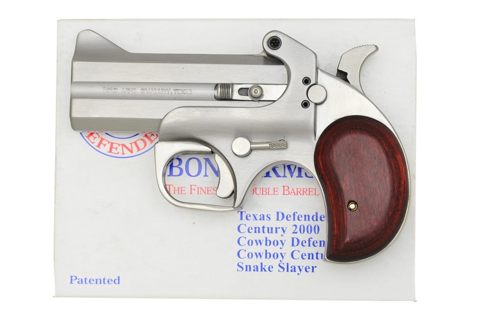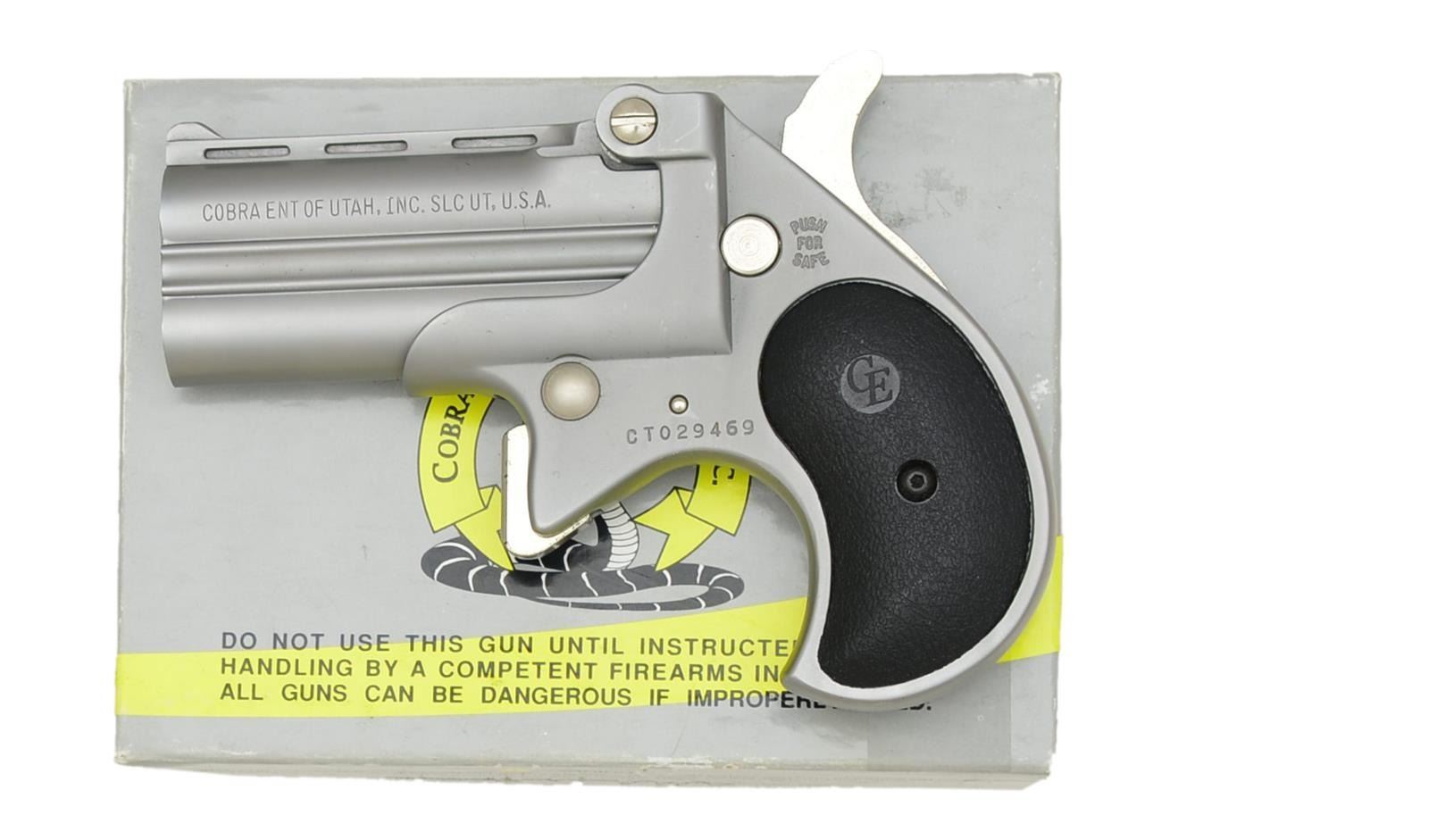 1) COBRA ENTERPRISES MODEL CB38. Cal. 38 Spl. S# CT029469. Bbls. 2 3/4" w/ rifled bores. Blade front sight. Spur trigger action w/ crossbolt safety & center mounted hammer having satin chrome finish. Bbls. tip upward for loading. 2 Piece plastic grip inserts. UNATTACHED ACCESSORIES: 2 piece box numbered to gun contains instructions, safety notice w/ cable lock, dry firing & warning cards. CONDITION: 95% finish showing light handling marks. Bores retain strong rifling. (21-591/DS). 2) BOND ARMS CENTURY 2000 DEFENDER C2K. Cal. 45 Colt / 410 Ga., 3". S# 30488. Bbls. 3 1/2" w/ rifled bores & integral blade front sight. Stainless steel construction. Action features center mounted hammer, crossbolt safety & left side release lever. Bbls. tip upward for loading. 2 Piece laminated rnd. butt grips. UNATTACHED ACCESSORIES: 2 piece box w/ non matching number. Box contains 2007 derringer ad & price list, warranty card, NRA card, instruction manual & allen wrench. Also includes a Brauer Bros. Mfg. Co. Model FB35 leather holster in fair condition. CONDITION: near excellent retaining 99% finish. Near excellent bore. (21-592/DS). 3) DAVIS INDUSTRIES MODEL D. Cal. 32 ACP. S# 132447. Bbls. 2 3/8" w/ blade front sight & manual extractor. Chrome finished action w/ spur trigger, center mounted hammer & right side opening lever. Bbls. tip upward for loading. 2 Piece laminated grip inserts. CONDITION: chrome finish shows sm. marks. Bores retain sound rifling. (21-603/DS). ALL MODERN. $500-750.