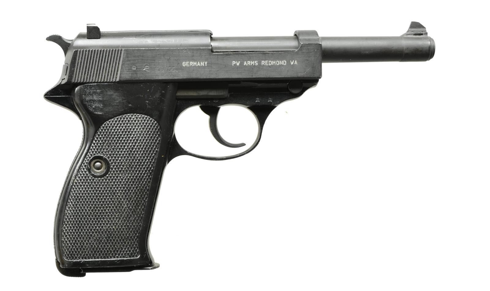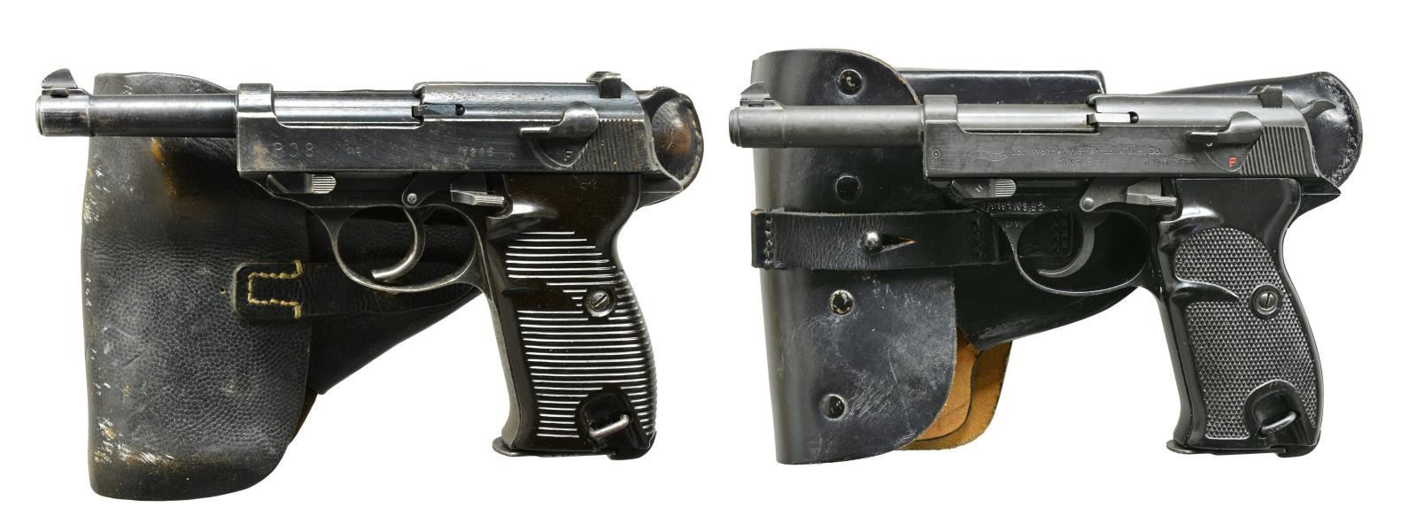 BOTH: 9mm Luger. Bbls. 5". 1. SPREEWERKE MODEL P38. S# 1206r. Mfg. late WWII w/ matching numbered slide, bbl. & locking block. Grooved chocolate brown Bakelite grips. Frame proofed by S# w/ Eagle & unreadable 2 digit #. MAGS: 2 fair to good 8 rd. factory w/ light to moderate oxidation. UNATTACHED ACCESSORIES: fair to good black pigskin flap holster w/ "DRAGG" inked under flap; stud & strap retention plus mag. pouch on front. Back has "P38, CXB/4 & eagle/WaA210". White scuffs on top of flap & thinning wear on high points; especially back. CONDITION: good plus overall w/ scattered light oxidation throughout. Very good bore w/ hint of frosting. (21-790/NW). 2. WALTHER MODEL P1. S# 379191W3.82. Slide marked 10/65 on right side along w/ 2 eagle proofs, GERMANY" & "PW ARMS" import marked. Left side of slide originally numbered "417"; restamped "191". Bbl. numbered "191"; unmarked marking block. Bbl. & slide marked w/ circle dot proofs. Frame w/ "BW" at left front of trigger guard plus 2 eagle proofs above right front of trigger guard. Checkered black plastic grips w/ thumb recess for RH use. MAGS: 2 very good Walther 8 rd. (1) P1 marked w/ "3/64" plus Nato stock #. (2) P38 marked w/ "4/60" plus Nato stock #. UNATTACHED ACCESSORIES: very good black flap holster w/ spare mag. pouch; stud strap retention. CONDITION: very good overall as refinished. Light marks & extra wear on right grip; near excellent bore. (21-868/NW). BOTH CURIO. $700-1,000.