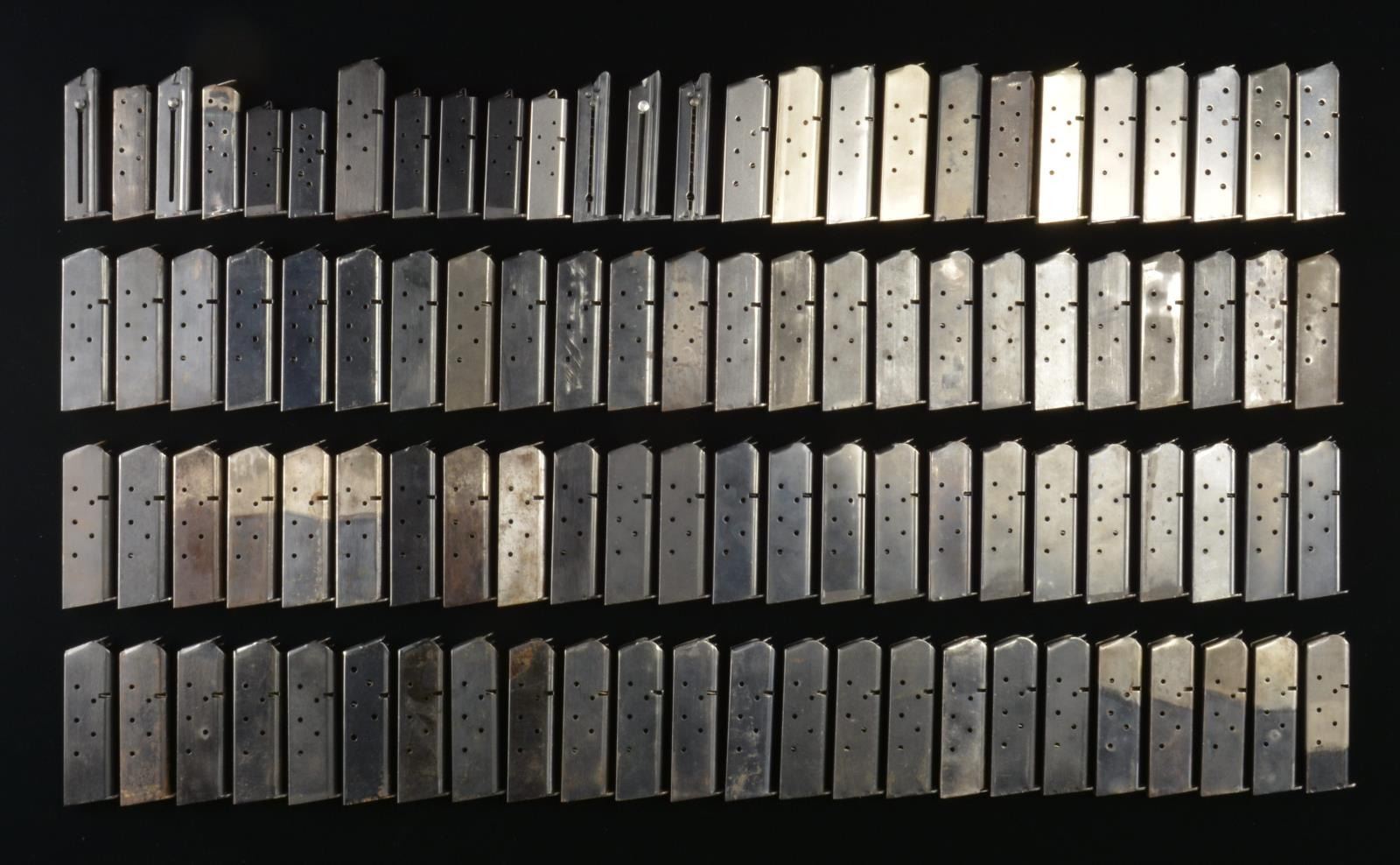 MODEL 1911 (all blued 7 rd. unless noted): 18 unmarked WWII style; 5 WWII style w/ deep swedged pins; 1 blued w/ deep swedged pins & seamed spine along w/ appropriate scratches reportedly caused by forming die of Singer manufacturer; 4 w/ ASSY #'s (3-8R611, 1-1M291); 1 similar appearing w/ white rubber bumper on base; 12 WWII contractor marked mags. (2 MS Little, 2 Scovill, 3 General Shaver, 5 Ridson); 5 factory Colt w/ rampant Colt; 10 factory Colt marked bases w/out rampant Colt; 8 w/ Colt marked bases reading in reverse of normal Colt markings & w/out rampant Colt; 1 unmarked aftermarket & 1 marked USA Magazines w/ removable base; 2 poor condition unmarked; 1 Pro-Mag. 10 rd. w/ plastic frame extender; 1 unmarked plated 20 rd. & removable base. / 2 TONE (1911 w/out lanyard loops): 7 unmarked, 2 by American Pin, 1 by Ridson. / STAINLESS (1911): 2 Colt marked 10 rd. w/ frame extenders; 5 aftermarket w/ Colt on bases in reverse position; 1 replated unmarked; 1 USA magazine w/ removable base; 1 Marlin; 1 Crown City Arms; 1 Para Ordnance; 1 unmarked Officer's Model; 1 Colt factory electroless nickel. / COLT WOODSMAN: 10 rd.; 3 aftermarket 1st series; 1 factory marked for bottom latch; 1 factory marked Match Target; 1 factory Model 1900; Model 1908 32 cal.; (Colt marked 2 tone & 1 unmarked aftermarket); 2 factory Mustang 380 cal. plus 2 unmarked reproductions; 3 factory Mustang Plus II; plus another electroless nickel; 1 unmarked aftermarket 25 ACP likely for Vest Pocket. CONDITION: varies from fair but useable, to almost near excellent. (02-14992-1/NW). $750-1,000.
