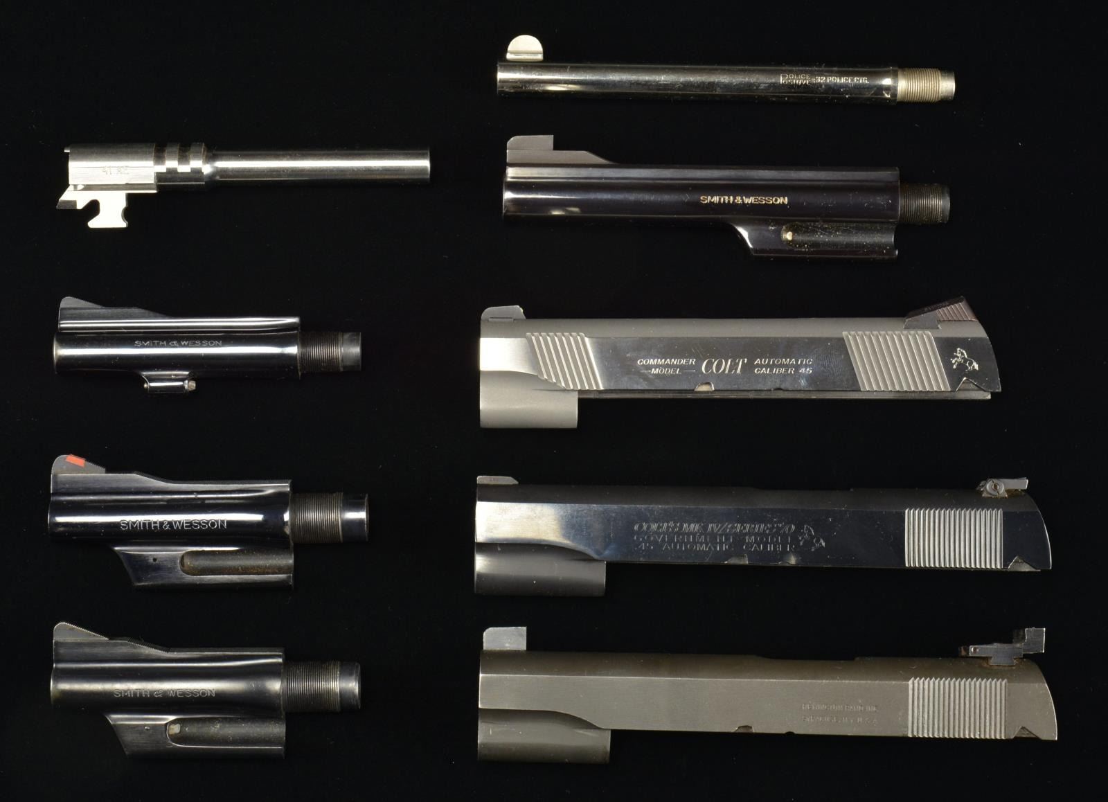 BARRELS: 1) New appearing Colt nickel plated 6" Police Positive bbl. w/ half moon front sight & cal. marked "32 POLICE CTG.". 2) Boxed Action Arms 41AE conversion bbl. for Browning Hi Power; appears new. 3) Near excellent blued S&W 4" K frame 22 LR pinned bbl. w/ grooved rib having serrated ramp front sight; no under lug. 4) Near excellent blued 4" S&W Highway Patrolman pinned 357 Mag. bbl. w/ serrated ramp front sight. 5) Very good plus blued 4" S&W Model 27 pinned 357 Mag. bbl. w/ red insert ramp front sight. 6) Very good plus blued 6" S&W Model 19 pinned 357 Mag. bbl. w/ Patridge front sight. SLIDES: 1) Colt stainless Lightweight Commander Model. Complete near excellent 80 Series w/ enhanced features of front & rear square cut cocking grooves plus lowered & flared ejection port. Blued 3 dot dovetailed sight set w/ finish loss; Novak style rear. 2) Colt 70 Series Government Model w/ factory quality refinish. Stripped except for filed down front sight & MMC white outline adj. rear. 3) Complete Remington Rand (parkerized) set up to AMU configuration w/ tall serrated faced Patridge front sight & Micro adj. rear. Very good w/ light use wear, high point wear & slight thinning. (02-14996/NW). $900-1,400.
