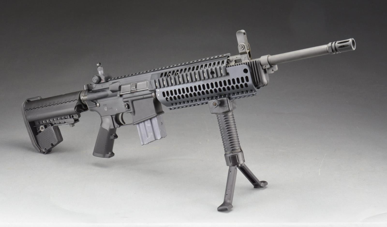 ASSEMBLY ON FACTORY M4 CARBINE. Cal. 5.56mm. S# LE389115. Bbl. 16.1". The latest entrant in the United States military Infantry Light Machine Gun category is the Colt Infantry Automatic Rifle (IAR). Taking over for the SAW weighing in at approx. 17 lbs. & the LMG at around 13 lbs. The IAR/M27 seems light at 9.5 lbs. by comparison. The IAR utilizes a patented monolithic upper receiver w/ numerous rail systems spanning 3, 6, 9, 12 o’clock. The longest coming in at almost 13" at 12 o’clock. One of the most recognizable features is the massive heatsink below the bbl. which is supposed to significantly reduce the risk of cook offs during extended periods of firing, as well as dramatically increasing bbl. life. Bbl. is threaded 1/7 RH w/ the intention at its length of 16.1" of pushing the muzzle velocity of M855 ammo around 2920 FPS. The IAR is a direct gas impingement system, firing from a closed bolt regardless of mode of fire. This example has a threaded muzzle & A2 flash hider w/ bayonet lug just forward of heat sink. Bbl. marked “13629 MP”, “5.56 NATO 1/7”. Folding front sight atop gas block. Folding precision peep rear sight, windage & elevation adj. Equipped w/ G.P.S. Grip Pod Systems retractable bipod/vertical forend. Brass deflector on upper receiver & rnd. forward assist. Markings on left side lower receiver as follows: “M4 CARBINE”, “CAL. 5.56MM”, “COLT DEFENSE”, “HARTFORD, CONN.”, “U.S.A.”. Selector markings “SAFE-FIRE” on left & right. VLTOR 4 position collapsible buttstock w/ trapdoor & tubes for battery & accessory storage. MAGS: 1-20 rd. & 1-30 rd. Colt aluminum. UNATTACHED ACCESSORIES: Colt padded nylon transport bag. CONDITION: finish is consistent & complete on all exposed surfaces. Brass deflector is void of any markings which indicates very little use if any beyond factory test firing. Bore is shiny w/ strong rifling. Fire control group appears to function correctly when cycled by hand. (21-749/JZ). MODERN. $1,200-1,800.
