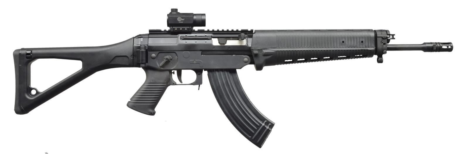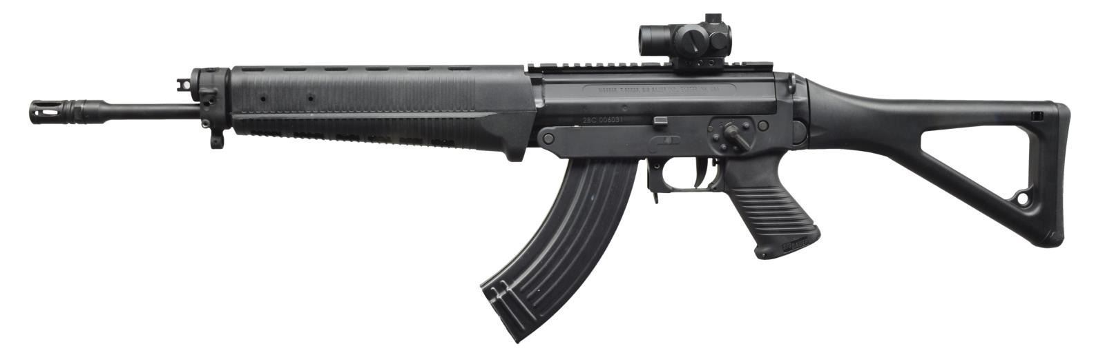 7.62X39. Cal. 7.62x39. S# 28C006031. Bbl. 16". Sig 556R platformed in the popular 7.62x39 chambering utilizing common AK47 mags. Bbl. is threaded & terminates w/ A2 type flash hider. Adj. gas system. Full length handguards. Black plastic furniture through. Flat top style upper receiver w/ 8.5" picatinny rail currently hosting a SIG brand adj. red dot sight w/ 2 night vision settings. Right side folding stock, which does not interfere w/ function & may be utilized open or closed. Paddle mag. release, ambidextrous safety/selector. Storage compartment in pistol grip. Matte black finish, Left side sling mounting. Left side bolt hold open device. MAGS: 1-30 rd. metal AK mag. UNATTACHED ACCESSORIES: rubber scope covers. Blue plastic foam lined Sig Sauer transport case. CONDITION: exterior finish unblemished w/ very little sign of usage beyond mag. well interior at points of mechanical intervention. Bore is shiny w/ strong rifling. Fire control mechanism appears to function correctly when cycled by hand. (21-728/JZ). MODERN. $800-1,200.