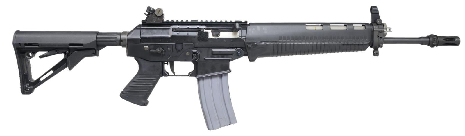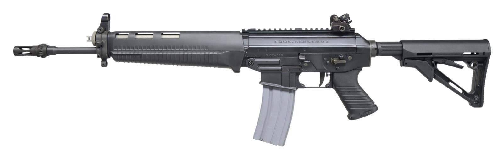 Cal. 5.56. S# JS024320. Bbl. 16". The Sig 556 classic is a modern sporting rifle w/ several time & battle proven attributes & has come to be known as a reliable as well as accurate entrant into this massive field. Matte black finish on all exposed metal surfaces. Interrupted thread muzzle brake, suitable as a quick detach mt. Adj. gas system. Removeable hooded blade front sight & 4 position drum style rear sight adj. for windage & elevation. 8.5" Picatinny rail “flat top” upper receiver. Ambidextrous safety/selector. 6 Position collapsible Magpull CTR shoulder stock. Pistol grip w/ trapdoor. Sockets for QD sling mounting. Two stage trigger. MAGS: 1-30 rd. aluminum. CONDITION: finish is dark & complete on the entirety of the exposed surfaces. Furniture is unblemished, the only area that may be a tattletale for usage of any kind is the area just rear of the ejection port where empty casings are quick to remove finish. This example has a 1/2" by 1/2" piece of velcro in this area, as an ejection port buffer. Bore is shiny w/ strong rifling. Fire control mechanism appears to function correctly when cycled by hand. (21-702/JZ). MODERN. $800-1,200.
