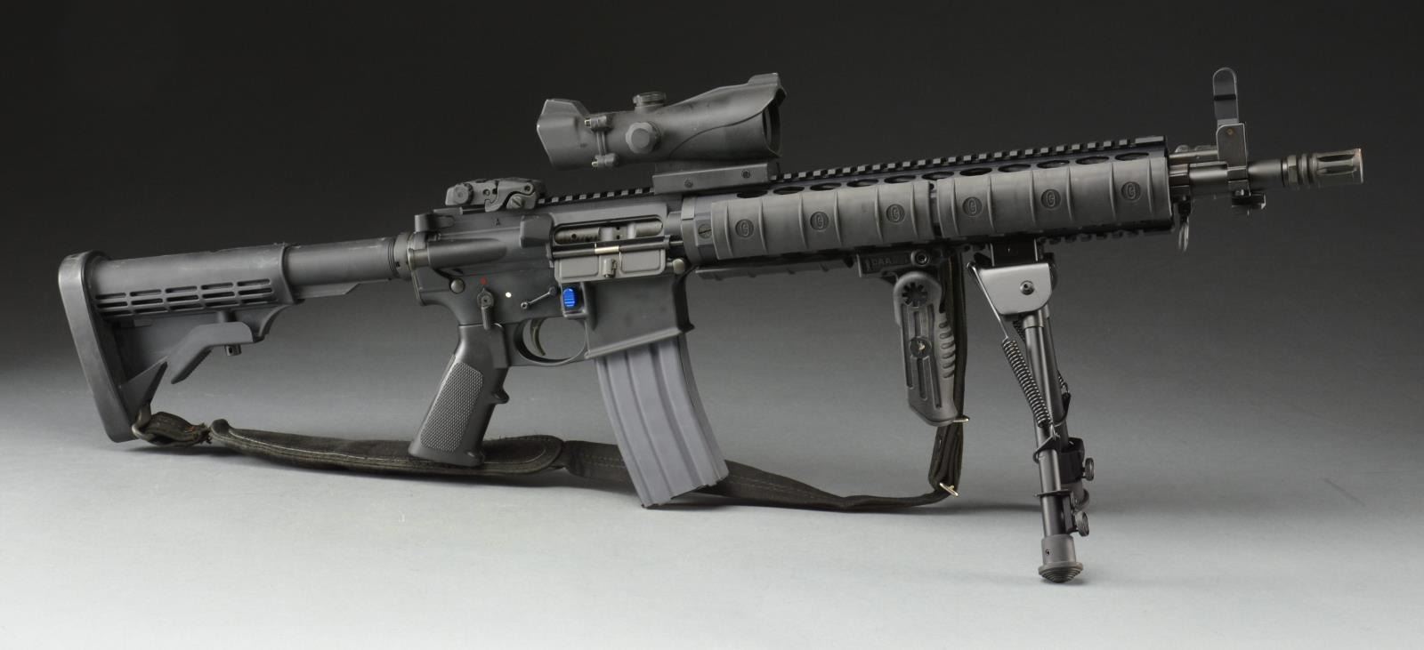 MANUFACTURING. Cal. 5.56 MM. S# 16176465. Bbl. 16”. Heavily accessorized custom assembled black rifle. Heavy bbl. w/ threaded muzzle terminated w/ A2 flash hider. Free floating 12” YHM quad rail for 18” of regulated mounting space at 12:00. Bottom rail plays host to CAA FVG & Harris style tubular UTG telescoping bipod. YHM folding front sight mounted on integral gas block/bayonet lug that appears to be duplicative since this system utilizes a midlength DGI gas system located under handguard. 6.5” Flashlight mounted at 9:00. Mounted mid length of rail is a Bushnell type red/green electronic sight. Black Magpul MBUS sight mounted at rear of rail. Flat top upper receiver w/ brass deflector & rnd. forward assist. Anderson lower w/ enlarged trigger guard utilizes extended magazine release, anti-walk pins & ambidextrous safety/ selector. Red & white dot mark Safe/Fire positions on both sides of receiver. 6 Position collapsible shoulder stock w/ slip on US Ordnance marked recoil pad. Black nylon sling attached at shoulder stock & QD socket mounted at 12:00 on YHM rail. MAGS: 1 aluminum 30 rd. CONDITION: several aspects of outward appearance indicate extremely low use. Bushnell sight appears to function in both red & green, though crosshair seems a bit blurry. Flashlight appears to work correctly. Shiny bore w/ decent rifling & fire control mechanism appears to function correctly when cycled by hand. (21-1485/JZ). MODERN. $600-900.