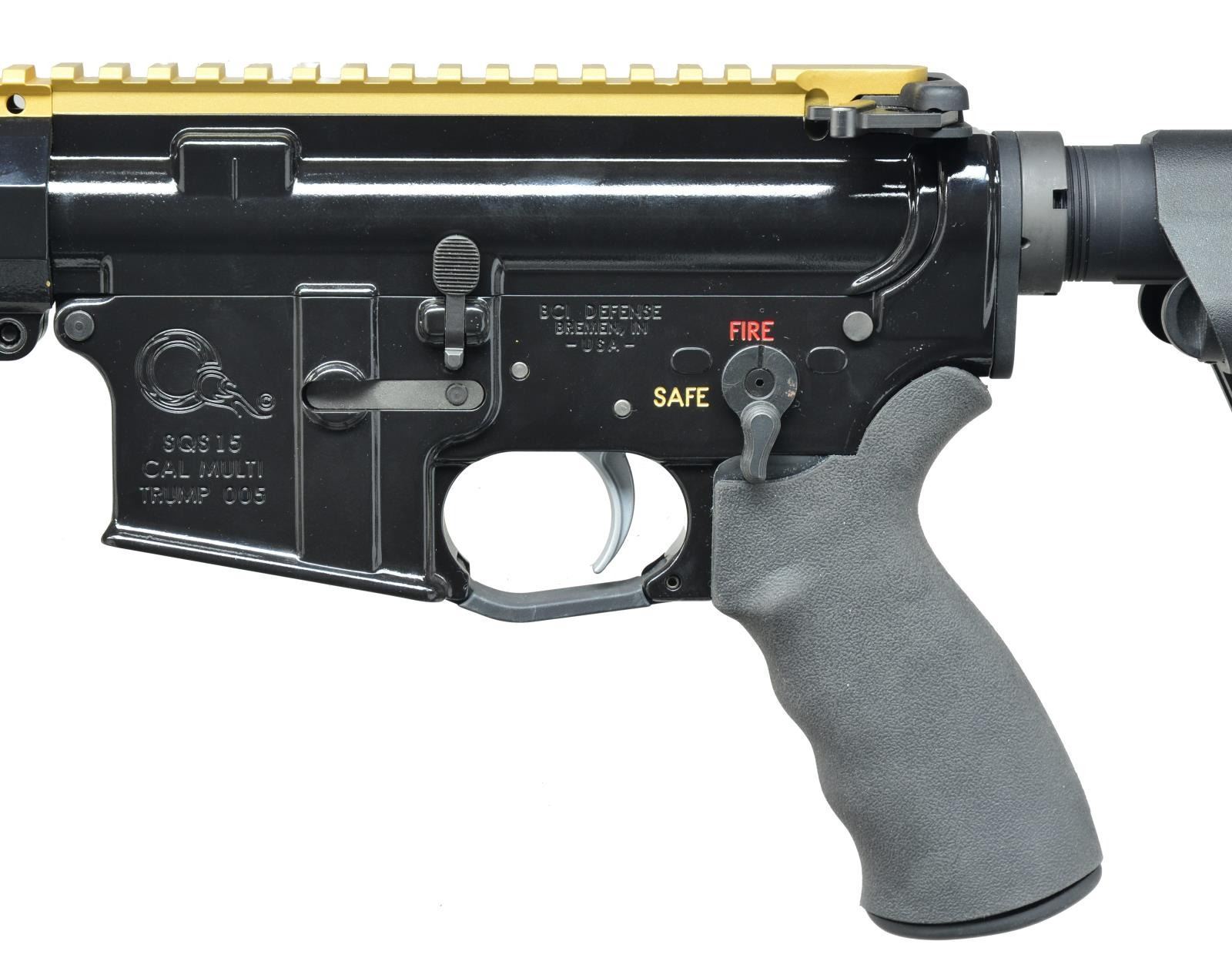 Cal. 5.56 NATO. S# TRUMP005. Bbl. 16". The BCI Defense Professional Series rifle is well known for quality & function over form. This particular example stands high above the rest, being one example of only 5 mfg. Wearing an attractive blend of black & gold cerakote & S# “TRUMP 005”. The 16” free floating bbl. is terminated w/ threaded muzzle & BCI’s 3 prong flash hider. The low profile gas block sits beneath the BCI defense M-LOK rail system providing over 20” of real estate for optic mounting w/ QD sockets front & rear on both sides. The flat top upper w/ brass deflector & rnd. forward assist sits atop the special run SQS 15 lower receiver, engraved “TRUMP” & “Make America Great Again” on the right side mag well w/ “TRUMP” highlighted in gold & his familiar phrase in red. Ambidextrous safety/selector marked both sides w/ “Fire” in red & “Safe” in gold. Ergo rubberized pistol grip w/ B5, 6 position collapsible shoulder stock w/ dual storage compartments for 123 Lithium batteries. BCI Defense bolt carrier, receiver, rail, buffer tube & even extended latch charging handle. UNATTACHED ACCESSORIES: factory foam line cardboard shipping box marked “Trump custom” & “Trump 005”. CONDITION: absolutely new in box. Black Cerakote has a high luster & is a stark contrast to the gold highlighted picatinny rail running the full length of the system as well as several highlighted markings. Shiny bore w/ strong rifling & fire control mechanism appears to function correctly when cycled by hand. (21-1590/JZ). MODERN. $1,500-2,500.