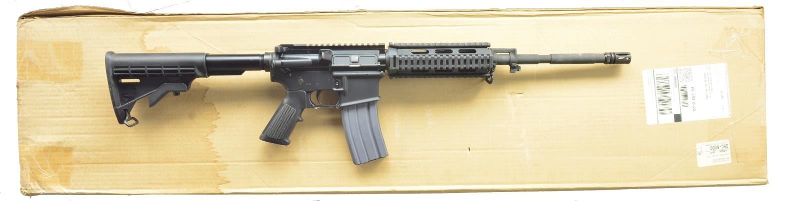 STYLE CARBINE. Cal. 5.56. S# L498606. Bbl. 16". An early collectible XM15 as mfg. in the Windham, ME facility where high quality & low tolerances became synonymous w/ the company name enough for Remington to purchase them. M4 profile bbl. w/ 1/9 rate of twist terminated w/ an A2 flash hider. Bayonet lug under low profile gas block. KZ quad rails w/ ladder covers behind sling swivel. Tapered delta ring. Flat top upper receiver w/ brass deflector & rnd. forward assist. 6 Position collapsible stock, Bushmaster branded w/ rear sling swivel. Dark matte black anodized finish on lower receiver w/ black satin finish upper. Heavy parkerized bbl. & gas block. MAGS: 1 aluminum 30 rd. UNATTACHED ACCESSORIES: branded black plastic case w/ styrofoam inserts, factory owner’s manual, black nylon sling, A2 style rnd. handguards w/ picatinny rail section. CONDITION: all outward appearances indicate little to no use. Brass deflector is the first surface area to succumb to wear & is completely unmarked. Shiny bore w/ strong rifling. Fire control mechanism appears to function correctly when cycled by hand. (21-727/JZ). MODERN. $800-1,200.