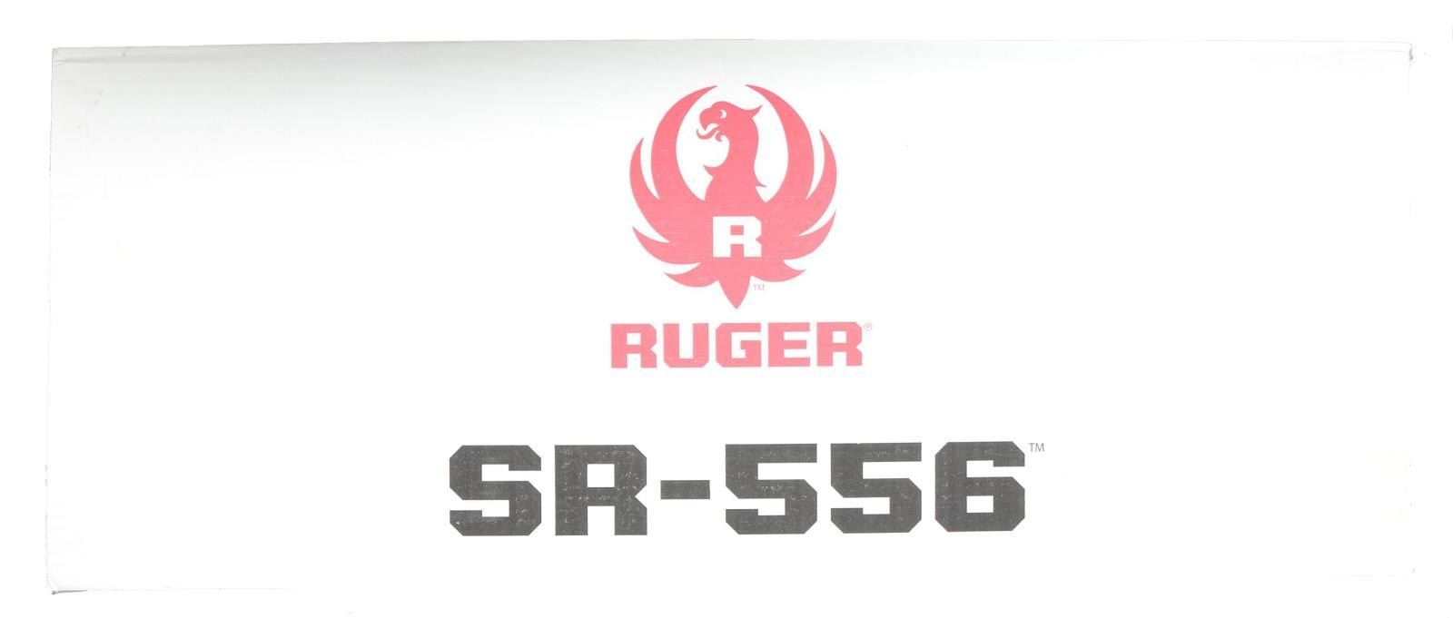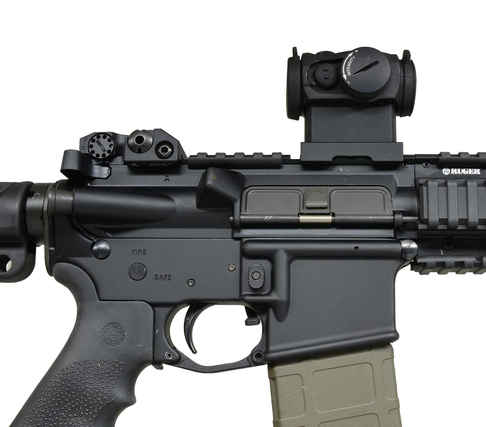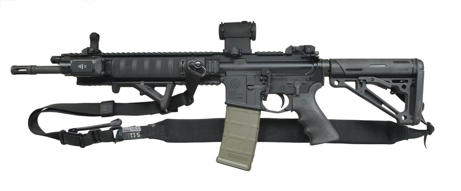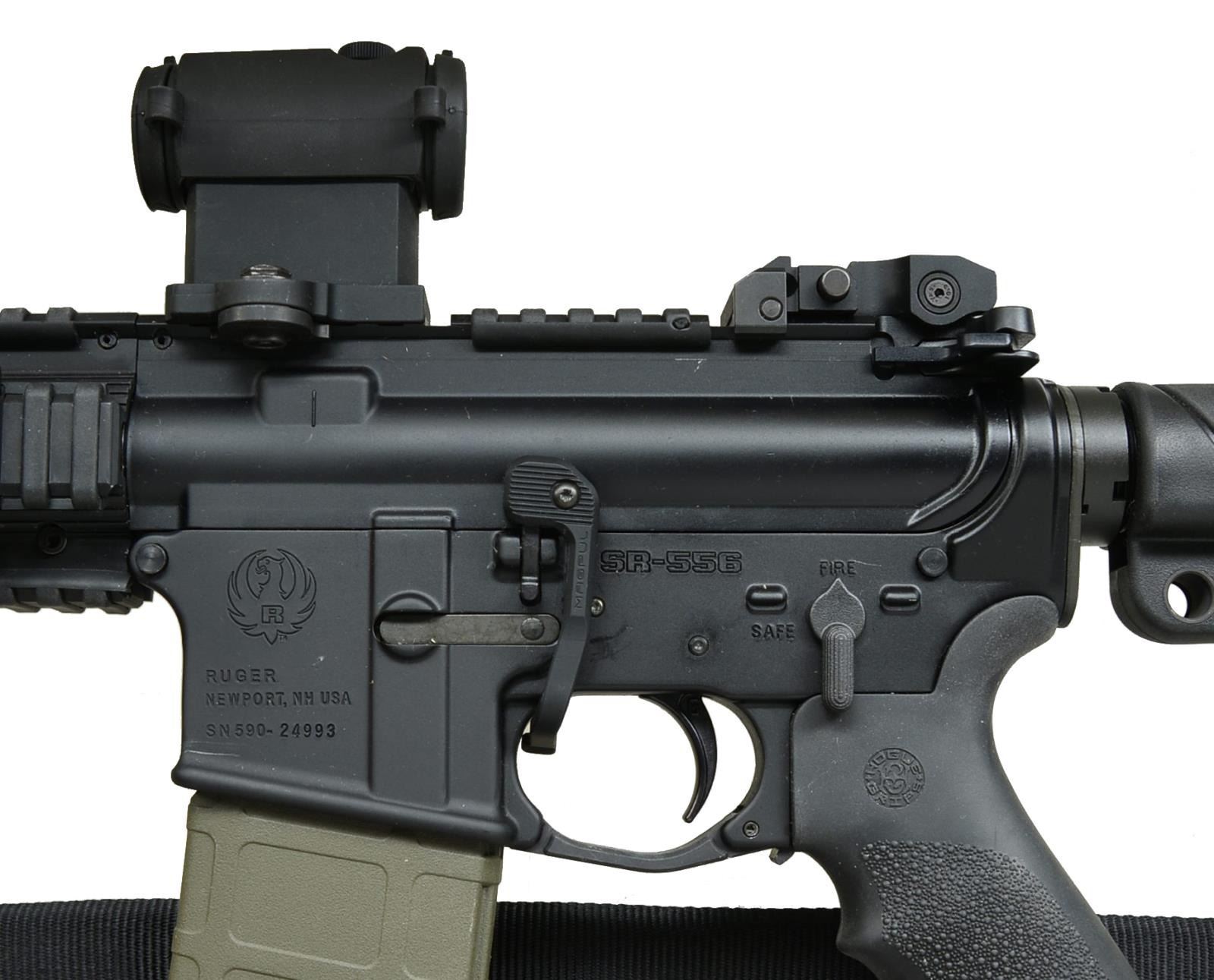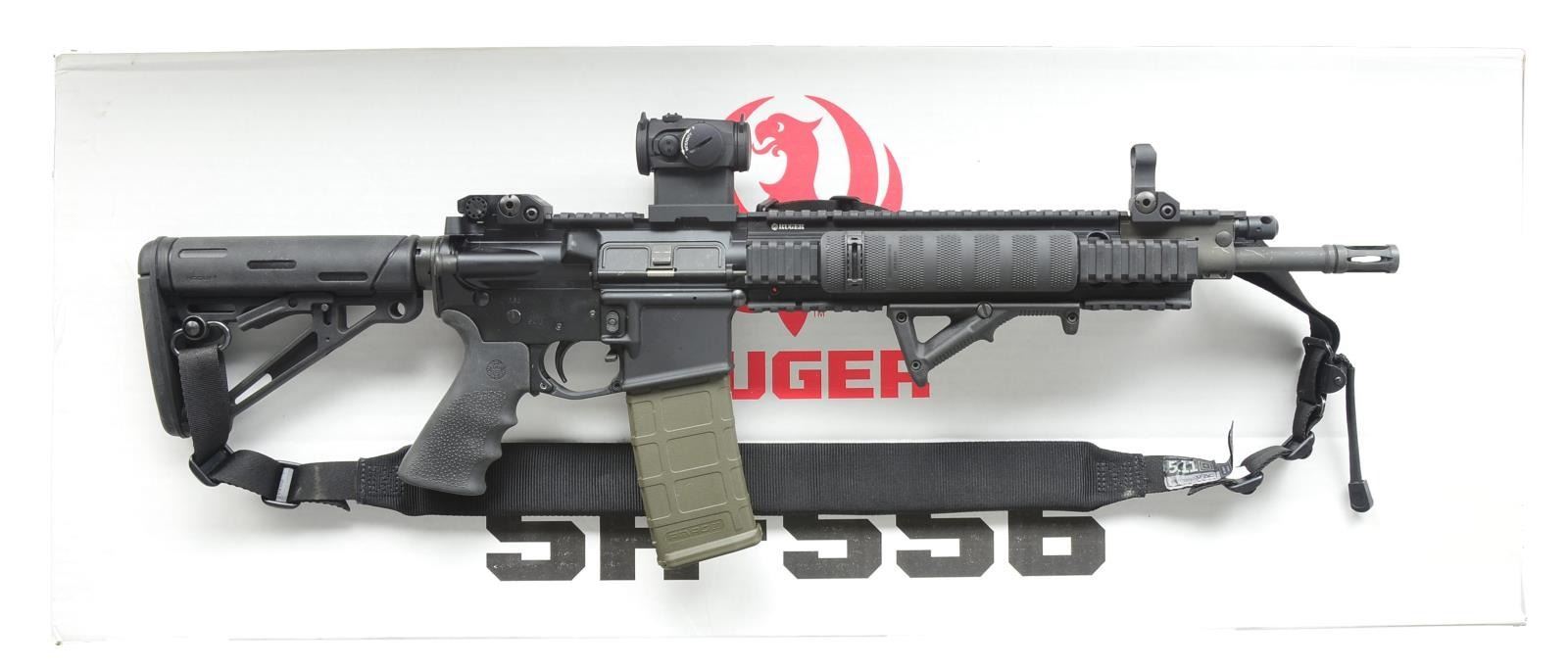 RED DOT SIGHT & PL2 WEAPON LIGHT. Cal. 5.56mm. S# 590-24993. Bbl. 16" over integral brake. Heavily accessorized piston-driven Ruger SR556 variant of the wildly popular Black Rifle. Dark black anodized matching finish on upper & lower receivers w/ parkerized bbl. Integral flash hider at the termination point at 1/9 bbl. Flat top upper receiver w/ brass deflector & rnd. forward assist is the beginning point of over 18" of regulated rail currently sporting flip up sights that greatly resemble the originals mfg. by Ruger. Front handguard composed of heavy rail system w/ 11" of mounting space at sides & on bottom currently occupied by Magpul AFG & O-Light Valkyrie PL2 light. Magpul ambidextrous extension to bolt release through trigger guard. Geissele trigger. Houge pistol grip. Houge 6-position collapsible buttstock. LaRue high profile scope mount w/ Micro type red dot sight. MAGS: 1 Magpul 30 rd. Pmag. CONDITION: finish on all exposed metal surfaces, correct & complete. Brass deflector illustrates some use w/ light scattered areas typically earned through vertical rack wear. PL2 Valkyrie & red dot sight both appear to function correctly. Rear stock fits unusually tight over buffer tube through first 3 settings & eventually loosens up. Shiny bore w/ good rifling. Fire control mechanism appears to function correctly when cycled by hand. (21-1063/JZ). MODERN. $600-1,000.