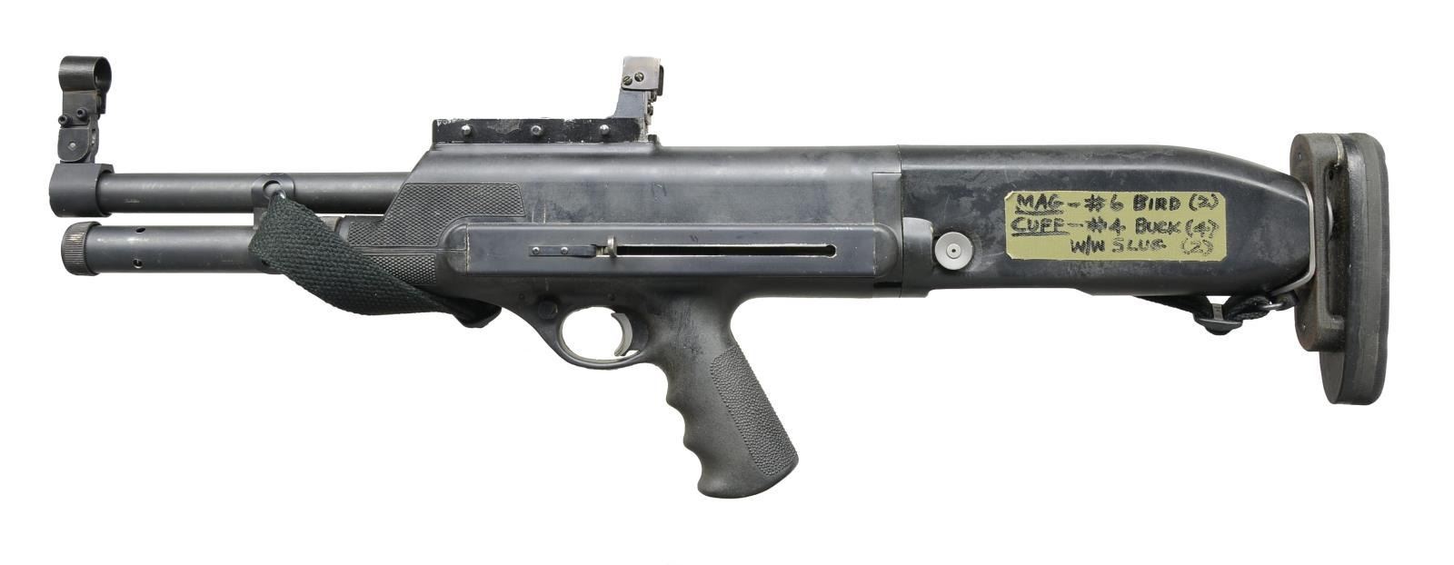SHOTGUN. Cal 12 Ga. S# A03509. Bbl. 18 1/8". Overall length: 27 1/4". Bullpup design w/ raked pistol grip, Pachmayr solid black Decelerator pad on metal mt. attached to back of receiver. Folding carry handle is removed. Folding covered blade front sight w/ protected square notch rear sight. Full length 4 rd. tubular mag. Left side of receiver has duct tape w/ shot size markings used by previous owner. Black web sling. Introduced in 1967, approx. 18,000 mfg. UNATTACHED ACCESSORIES: green canvas Kolpin zippered gun case of appropriate length. CONDITION: visible metal parts retain 70% finish showing wear & handling marks. Synthetic stock shows scuffs & light wear. Rear sight base shows edge wear & handling marks. Right rear sight guard is bent inwards. Good bright bore. (21-692/DS). MODERN. $700-1,000.