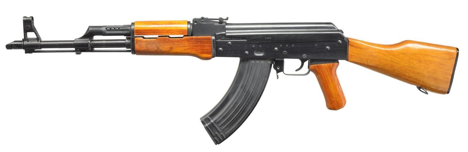 Cal. 7.62x39. S# 300496. Bbl. 16". A very early semi-auto AK-47 variant imported from China through Import Arms Company Sacramento, CA. Blued finish on exposed metal surfaces. Front trunnion marked "56S" along w/ the triangle 66 Arsenal mark. Import markings on bottom of receiver "IA CO SAC CA"/ PRC 7.62 NORINCO". Correct yellow/red tinted wooden furniture & reinforced stamped receiver. Proper slant muzzle break in front of hooded post front sight. Gas block/ bayonet lug play host to on board cleaning rod. Tangent rear sight marked to 800 meters. Right side controls. Trap door butt stock includes cleaning kit remainder. Matching numbers on several sm. parts & receiver. Front handguard slotted to accept folding bayonet. MAGS:1 metal 30 rd. CONDITION: exterior surfaces still retain the vast majority of their original finish. The only exception is in the area of receiver & selector where a fine line wears almost immediately to due mechanical intervention. Bright bore w/ aggressive rifling. Fire control mechanism appears to function correctly when cycled by hand. (21-1450/JZ). MODERN. $800-1,200.