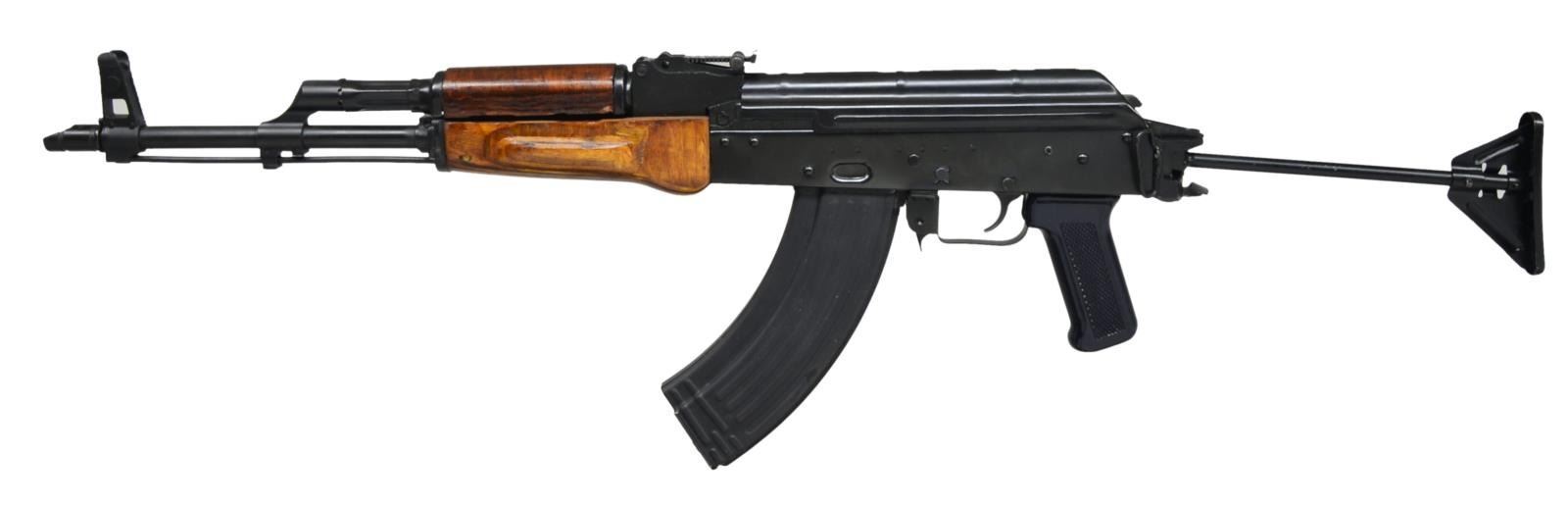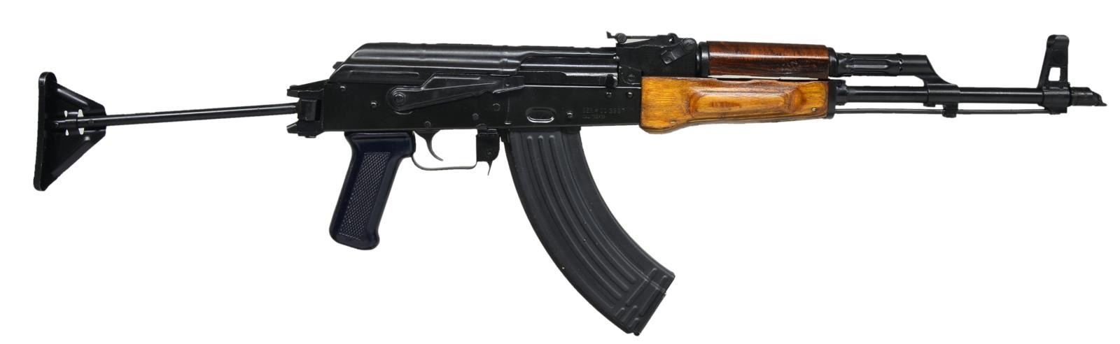 Cal. 7.63x39. S# CC3997. Bbl. 16". An Egyptian MAADI AK47 variant built on an Elk River stamped receiver w/ right side folding wire stock. Characteristic satin black finish on all exposed metal surfaces. Left hand threaded muzzle w/ Tapco USA slant brake. Protected post front sight & bayonet lug play host to onboard cleaning rod. Signature MAADI orange tinted laminated wood furniture. Black plastic pistol grip. Rear tangent sight elevation adj. to 1000m. Left side sling swivel front & rear. MAGS: 1-30 rd. metal. UNATTACHED ACCESSORIES: VSIM nylon transport bag. CONDITION: black painted finish complete & consistent on all exposed metal surfaces laminated forend has what appears to be a hairline crack following the laminated grain toward the center. Stock locks tightly in both open & closed positions. Finish surface between selector & receiver is only gently thinning, illustrating very little use. Clean bore w/ well pronounced rifling. Fire control mechanism appears to function correctly when cycled by hand. (21-780/JZ). MODERN. $600-900.