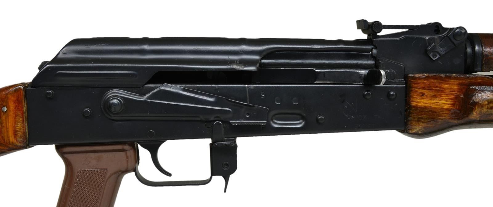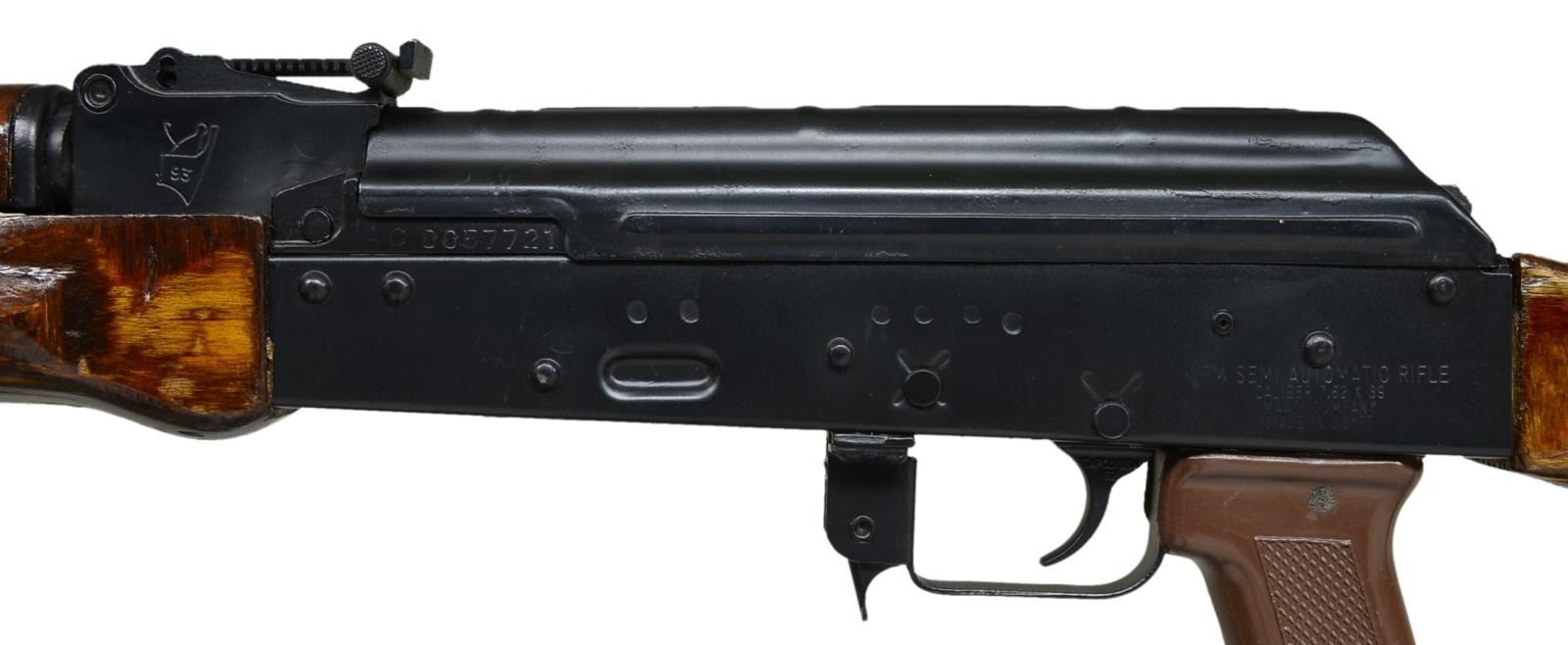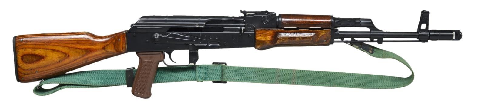 Cal. 7.62x39. S# AC0057721. Bbl. 18 3/4". The orange/brown tinted laminated wood is an immediate indication of an Egyptian mfg. MAADI ARM AK-47 variant. A stamped receiver, sans scope mount, & a dark matte black finish on all exposed metal surfaces. The muzzle brake appears to be permanently attached via a sm. weld at the base of the front sight & the ears of the bayonet lug have been trimmed down. Correct left front sling swivel corresponds w/ rear stock sling swivel & is outfitted w/ a green canvas sling. Front sight protected post corresponding w/ an elevation adj. rear sight out to 1000m. A.C.C./Intrac import. Tapco USA G2 trigger, on board cleaning rod & black plastic checkered pistol grip. CONDITION: finish on all exposed metal surfaces is complete w/ no apparent visible degradation aside from areas of mechanical intervention, such as between selector & receiver as well as a few light dings on top cover that typically correspond w/ ejection. Furniture has a few light dings & impressions as is common on every MAADI we’ve seen in the past. Clean bore w/ aggressive rifling. Fire control mechanism appears to function correctly when cycled by hand. (21-694/JZ). MODERN. $400-800.