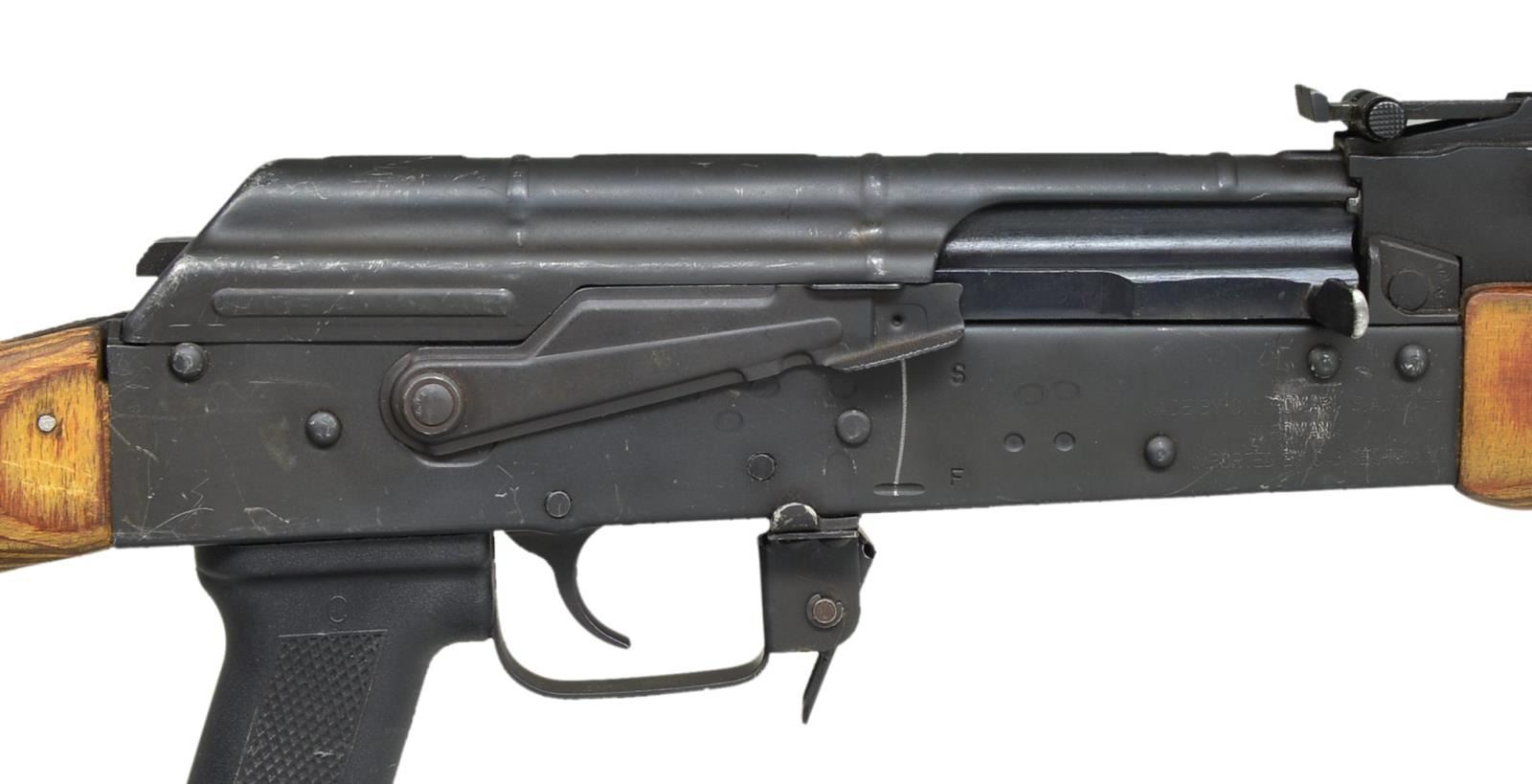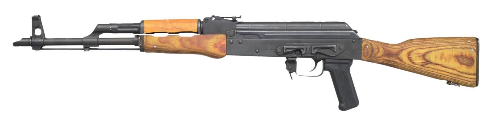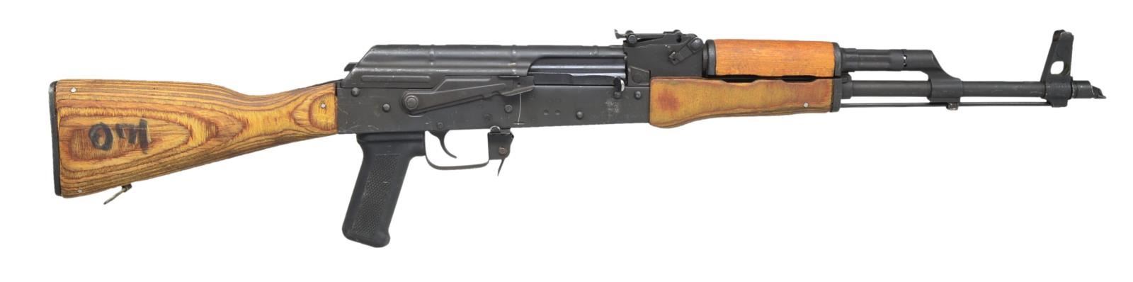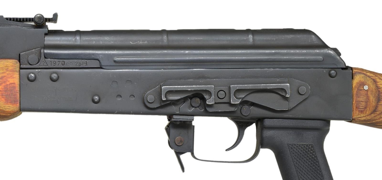 Cal. 7.62x39. S# 1970CO2381. Bbl. 16". In the early days of the War on Terror, the United States utilized several outside contractors for security projects in Iraq & Afghanistan. One such company, SOC-USA, utilized numerous Romanian WASR AKs which were later imported into the USA and marketed as "Iraqi Contractor WASR 10 AK47s". This is one of these guns, believed to had been used in the ME Theater imported through CAI in Georgia, VT. Slanted muzzle brake w/ proper left hand thread in front of protected post front sight, on board cleaning rod supported w/ bayonet lug. Rear sight adj. from 200-1000m. Black matte finish on all exposed metal surfaces. Left side original style scope mount. Correct laminated wood furniture w/ black plastic pistol grip & Tapco trigger. UNATTACHED ACCESSORIES: cleaning kit in rear stock trapdoor. CONDITION: original flat black metal finish is complete & consistent. High spot finish wear on scope mount & scratching below charging handle, probably from storage. Lettering that appears to be black marker on right side of stock. Bore is shiny w/ strong rifling. Fire control mechanism appears to function correctly when cycled by hand. (21-693/JZ). MODERN. $800-1,200.