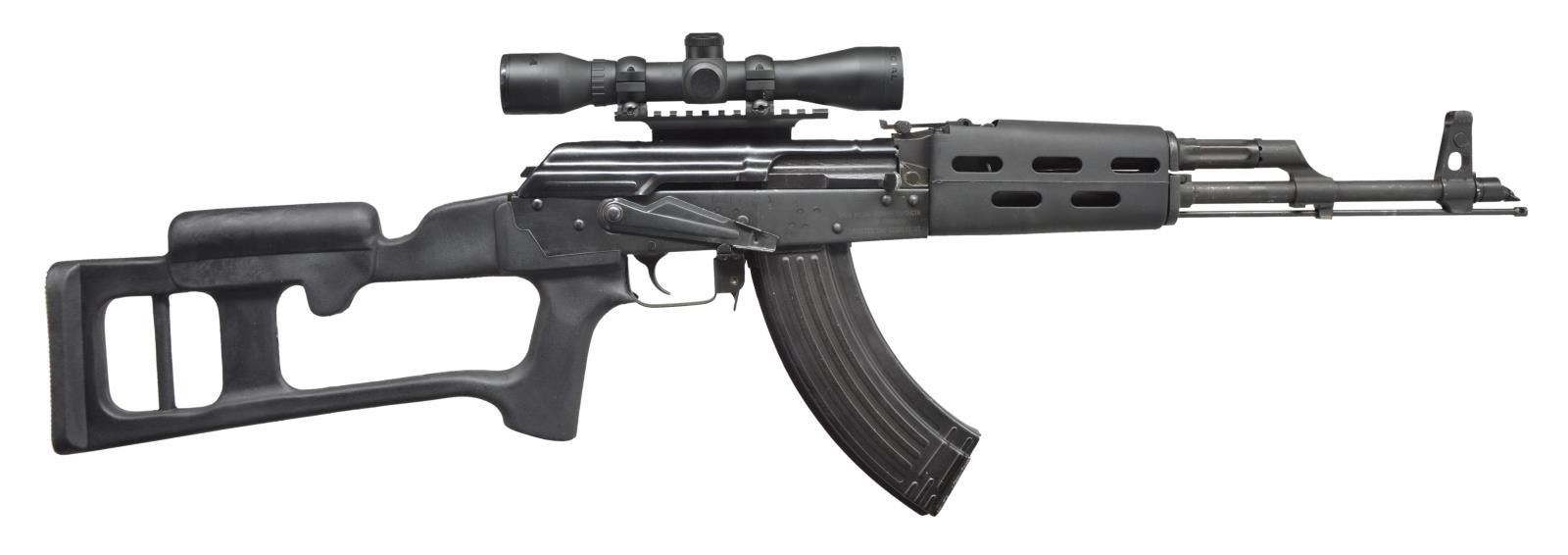 SYNTHETIC STOCK. Cal. 7.62x39. S# SBJ-3937-86R0. Bbl. 16 1/2". Stamped WASR-10 imported by CAI. Left hand threaded muzzle w/ correct slant brake. Standard protected post sight & elevation adj. rear sight to 1000m. On board cleaning rod w/ bayonet lug. Right side safety selector w/ left side receiver scope mt. Aftermarket rail attached to mt. w/ picatinny mounting surfaces at 9 o’clock & 12 o’clock. 4x32 BSA Scope w/ duplex crosshair & covers. Black plastic aftermarket Dragonov style stock & forend. Tapco trigger. MAGS: 3 metal 30 rd. UNATTACHED ACCESSORIES: foam lined plastic rifle case. CONDITION: complete finish coverage on all exposed metal surfaces, flat black bbl. & receiver w/ matte finish top cover, exhibits normal thinning & marks related to normal use & storage, scope appears clear, plastic stocks free of any noticeable imperfections, bore is shiny w/ well pronounced rifling. Fire control mechanism appears to function correctly when cycled by hand. (21-217/JZ). MODERN. $300-500.
