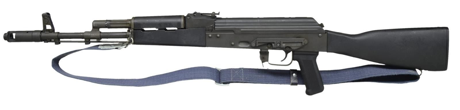Cal. 5.45x39. S# J000210. Bbl. 16". An extremely clean AK variant built on a NODAK Spud stamped receiver, complete w/ left side scope mount. Slim line black plastic furniture all around, 24mm right hand thread Bulgarian style brake. On board cleaning rod held captive through bayonet lugs below front sight & gas lock. Protected post front sight w/ elevation adj. rear sight from 100-1000m. Tapco G2 trigger. Left side front sling attachment point, currently affixed to denim blue cloth web sling through rear stock mounting point. CONDITION: firearm appears unused by all outward aspects; the finish is unblemished & furniture is unmarked. Very light line of thinning on receiver below safety/selector. Bore is shiny w/ excellent rifling. Fire control mechanism appears to function correctly when cycled by hand. (21-699/JZ). MODERN. $400-600.
