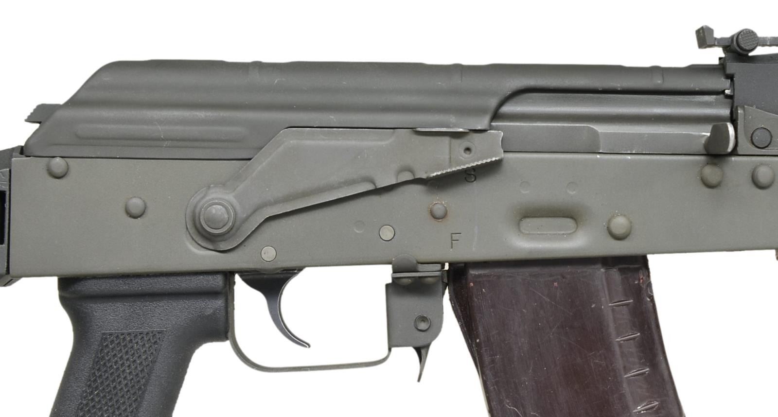 INTERARMS. Cal. 5.45x39. S# TTL-C01797. Bbl. 16 1/2". A Polish WZ88 TANTAL build from Interarms. Correct 4" muzzle brake & right side folding wire stock. Black plastic pistol grip w/ red bakelite type handguards. Left side sling swivels. Stamped receiver. Tapco G2 trigger. Protected post front sight in bayonet lugs secure on board cleaning rod. Tangent rear sight marked to 1000m. Ambidextrous safety/selector. Marked on left side of receiver “C-P-S”, on right side of receiver marked “S-F”. Greenish gray matte finish parkerizing on all exposed metal surfaces. Left side sling swivels host green canvas sling. MAGS: 1-30 rd.; correct brown plastic. UNATTACHED ACCESSORIES: VSIM transport bag. CONDITION: finish coverage is completely consistent w/ only light thinning at points of mechanical intervention pointing to what appears to be very low use. Stock has rubber buffer inserted at top to cut down on noise while folded. Furniture is free of any noticeable blemishing. Bore is shiny w/ well pronounced rifling. Fire control mechanism appears to function correctly when cycled by hand. (21-783/JZ). MODERN. $600-900.