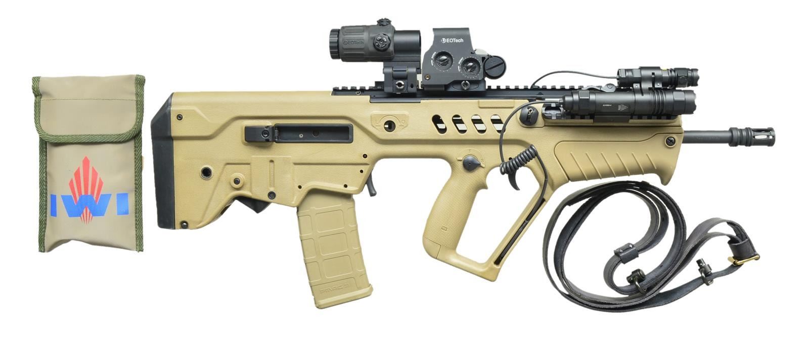 Cal. 5.56x45. S# T0007313. Bbl. 16 1/2". The Tavor SAR is a 5.56x45 MM battle proven, Bullpup style rifle mfg. originally for the Israel Defense Forces (IDF). Since its initial introduction to the US market in 2014 it has been wildly popular. It utilizes a rotating bolt, long stoke piston mechanism & feeds from standard M16 family magazines. This example is a flat dark earth (FDE) SAR Flat Top, which incorporates a 14” picatinny rail as a sight mounting point in addition to a 6” rail located opposite the charging handle at a 45° angle. The Tavor utilizes an ingenious sight mechanism composed of a front blade w/ a tritium insert & corresponding rear sight that fold in to the rail system when using optics. Currently mounted is an EOTech L3 holographic weapon sight in front of an EOTech flip down magnifier both on QD mounts. The 1:7, 5.56 NATO hammer forged chrome lined bbl. is terminated w/ a threaded muzzle & A2 style flash hider & is currently configured for right hand use. On the 45° angled rail is an aftermarket laser & light combination. MAGS: 1 tan 30 rd. PMAG. UNATTACHED ACCESSORIES: IWI cleaning kit in factory pouch. Tavor SAR owners manual & EOTech operators manual. Brown leather sling w/ QD sockets. CONDITION: while the FDE chassis exhibits some light staining which is earned quickly. No significant wear apparent on any parts. EOTech sight & magnifier appear to work correctly as does laser/ light combination. Bore is shiny w/ strong rifling & fire control mechanism appears to function correctly when cycled by hand. (21-1516/JZ). MODERN. $900-1,400.
