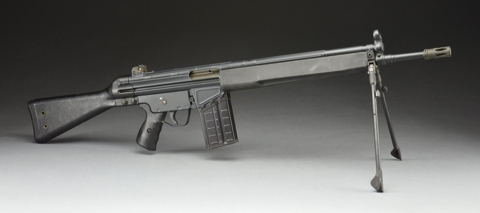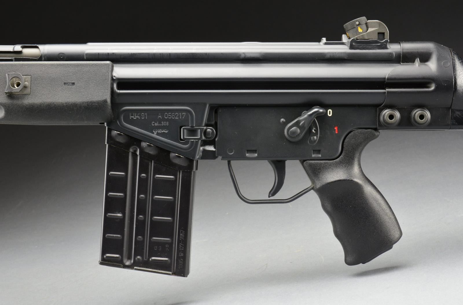 Cal. 308. S# A056217. Bbl. 17.7" w/ factory flash hider. Standard A-2 model w/ black plastic stock set. Includes factory bipod. Factory 4 position drum style rear sight assembly. Hooded post front sight. Push button mag. release w/ 0-1 metal clip on trigger housing. Mag. well right side marked, "Made in Germany, HK Inc., Arl. Va. 22- 201". Left side mag. well marked, "HK91 A038695, Cal..308, eagle IC antler" indicating 1982 mfg. MAGS: 3 aluminum 20 rd. UNATTACHED ACCESSORIES: HK heavy padded transport bag. CONDITION: light black factory paint on all exposed metal surfaces remains consistent & correct. Light thinning in areas that coincide w/ scope mt. use. Furniture free of any noticeable outward defect. Bipod folds correctly & locks tight both in open & closed position. Bore is shiny w/ well pronounced rifling & fire control mechanism appears to function correctly when cycled by hand. (21-771/JZ). MODERN. $1,800-2,500.
