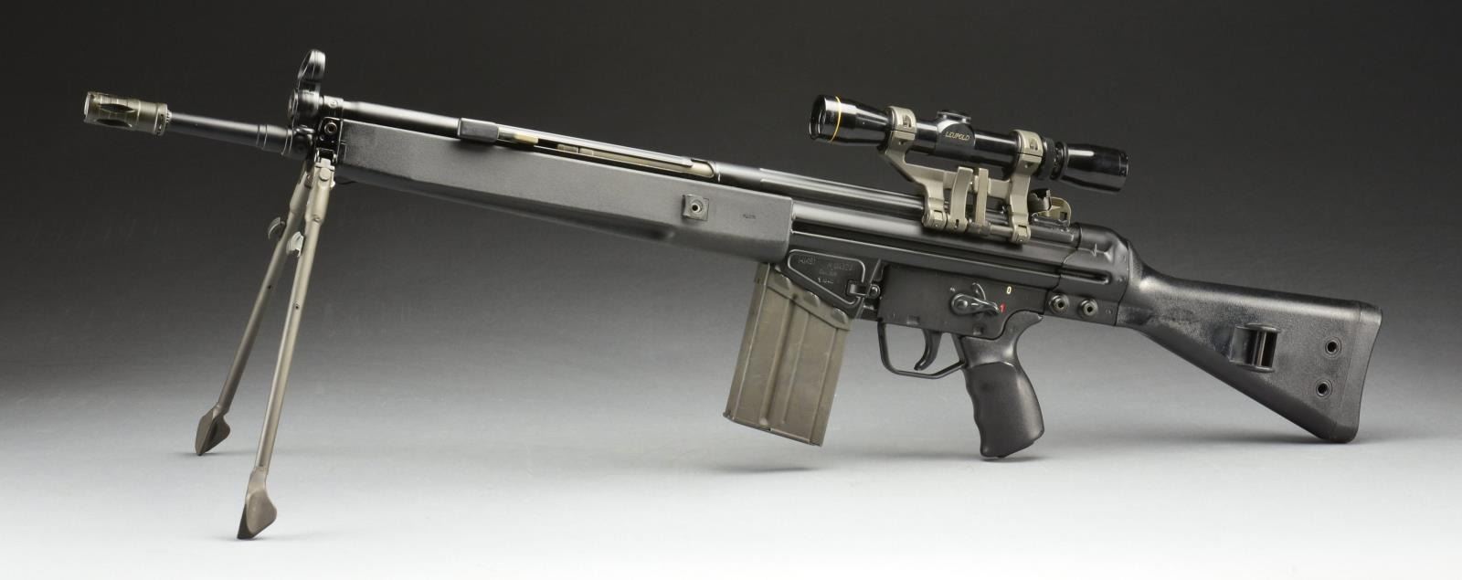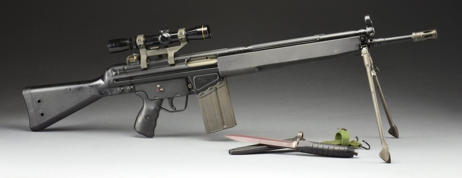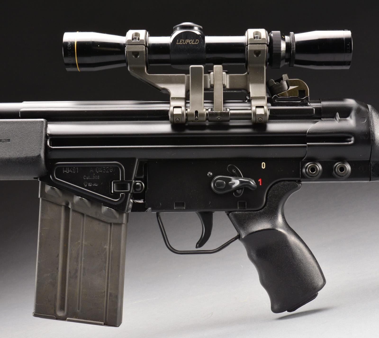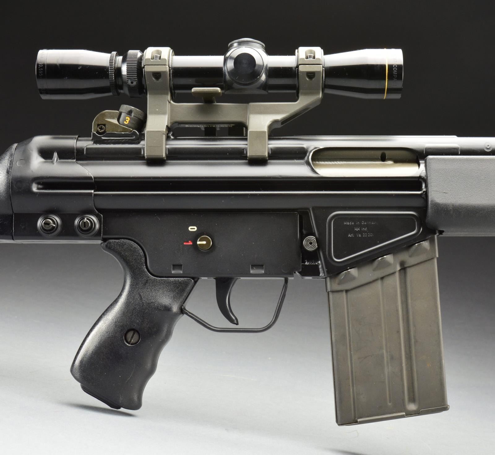 REFURBISHED. Cal. 308. S# A043297. Bbl. 17.7" w/ factory flash hider. Standard A2 model w/ black plastic stock set. Includes factory bipod. Factory 4 position drum style rear sight assembly. Hooded post front sight. Push button mag. release w/ 0-1 metal clip on trigger housing. Mag. well right side marked “MADE IN GERMANY, HK INC., ARL. VA. 22-201”. Left side mag. well marked “HK91 A043297 CAL..308 EAGLE IB ANTLER” indicating 1981 mfg. Currently sporting German claw scope mt. “SchuBrichtung” between gun & scope. Also sporting a Leupold Vari-X 2x7 compact scope w/ duplex crosshair & bikini covers. MAGS: 1 steel 20 rd. UNATTACHED ACCESSORIES: photo copy G3 owner’s manual, some factory paperwork, HK bayonet & original factory box. CONDITION: rifle finish is correct & complete w/ no degradation on any exposed areas. Paperwork received w/ rifle indicates factory rebarreling & possibly refinishing in 1991. Scope appears clear w/ well defined crosshairs. Bore is shiny w/ strong rifling. Fire control mechanism appears to function correctly when cycled by hand. (21-894/JZ). MODERN. $1,800-2,800.