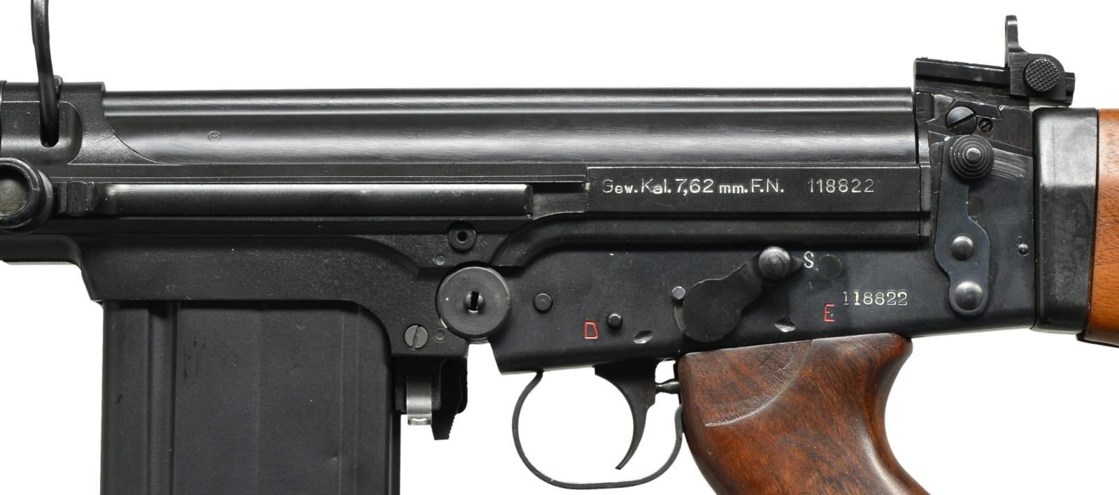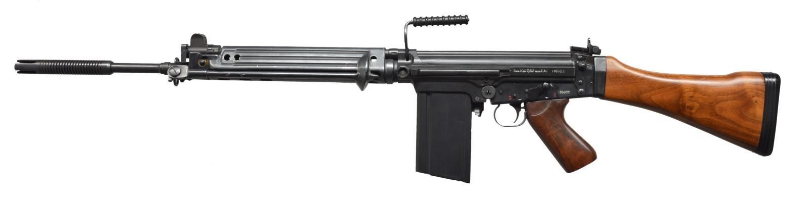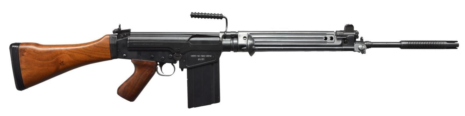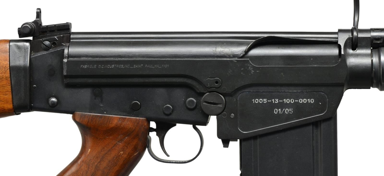 Cal. 308. S# 118822. Bbl. 21". Metric FAL w/ German G1 handguard & bipod. Gas piston operated w/ protected post front sight & rear peep sight elevation adj. from 200-600m. 5.5" Flash hider/grenade launcher. Wooden buttstock w/ recoil pad & corresponding wooden pistol grip. Matching numbers upper & lower receiver: 118822. Left side upper receiver markings “Gew.Kal. 7,62mm.F.N. 118822”. Right side upper receiver markings “FABRIQUE D.C. INDUSTRIES, INC._SAINT PAUL, M:G1”, also marked “1005-13-100-0010” & “01/05” on mag. well. With proper carry handle. Sling swivel rotates 360 degrees on bbl. in front of bipod. MAGS: 1 repainted 20 rd. metal. CONDITION: finish is completely consistent on all exposed metal parts. Stocks have typical era appropriate impressions but nothing beyond minor cosmetic imperfections readily visible. Handguard finish scratched & thinning on some high surface areas. Bore is clean w/ strong rifling. Action appears to function correctly when cycled by hand. (21-337/JZ). MODERN. $1,200-1,800.