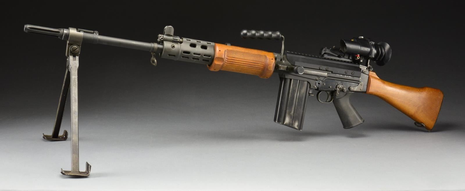 SIGHT. Cal. 308. S# 87129. Bbl. 25". A genuine Israeli mfg. heavy S.A. FAL rifle. This is not a parts kit assembled on a different receiver, but a true S.B.L.-Israel rifle as imported by Onyx Arms. Proper wood forearm beneath factory folding carry handle & ventilated bbl. shroud, exactly like the machine gun. Dark black finish is a combination of paint & parkerizing. Still retains heavy folding bipod on bbl. & folding shoulder rest on stock. Israeli writing throughout, including both receivers & some sm. parts. Augmented w/ the addition of a heavy duty SA58 top cover mfg. by DSA which provides over 8" of picatinny rail currently sporting original Israeli Trilux sight w/ original Israeli data plate. Front sight is factory protected post w/ rear tangent peep sight. 360 Degree front sling swivel w/ 6 o’clock sling swivel on rear stock. MAGS: 1-20 rd. UNATTACHED ACCESSORIES: aluminum lockable foam lined transport case. CONDITION: all surfaces appear to retain the fast majority of their original finish. Wood stocks free of any obvious blemishing. Metal finish coverage is complete & consistent w/ thinning only in sparse scattered areas primarily those of mechanical intervention. Unique Trilux sight appears reasonably clear w/ top mounted post coming to a sharp point. Clean bore w/ strong rifling. Fire control mechanism appears to function correctly when cycled by hand. (21-777/JZ). MODERN. $1,500-2,500.