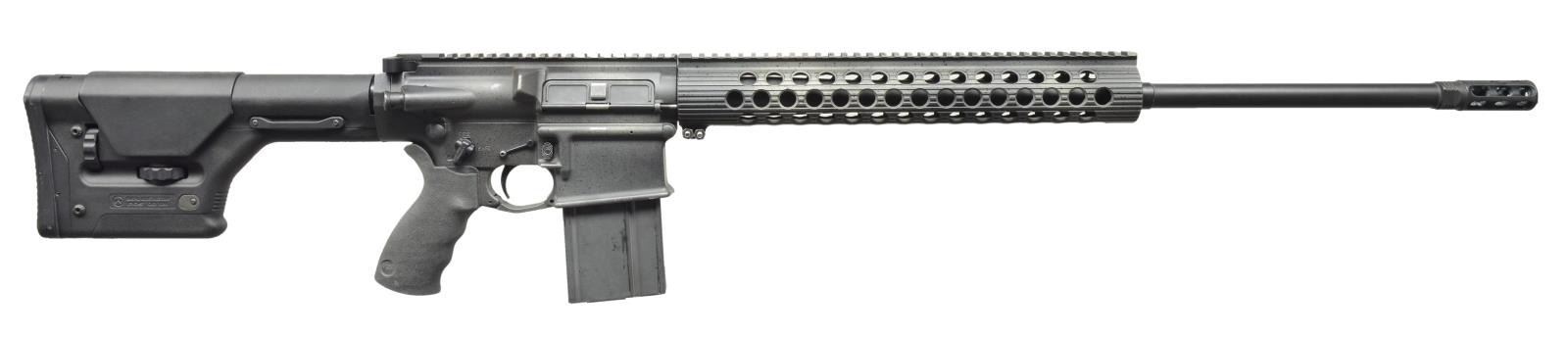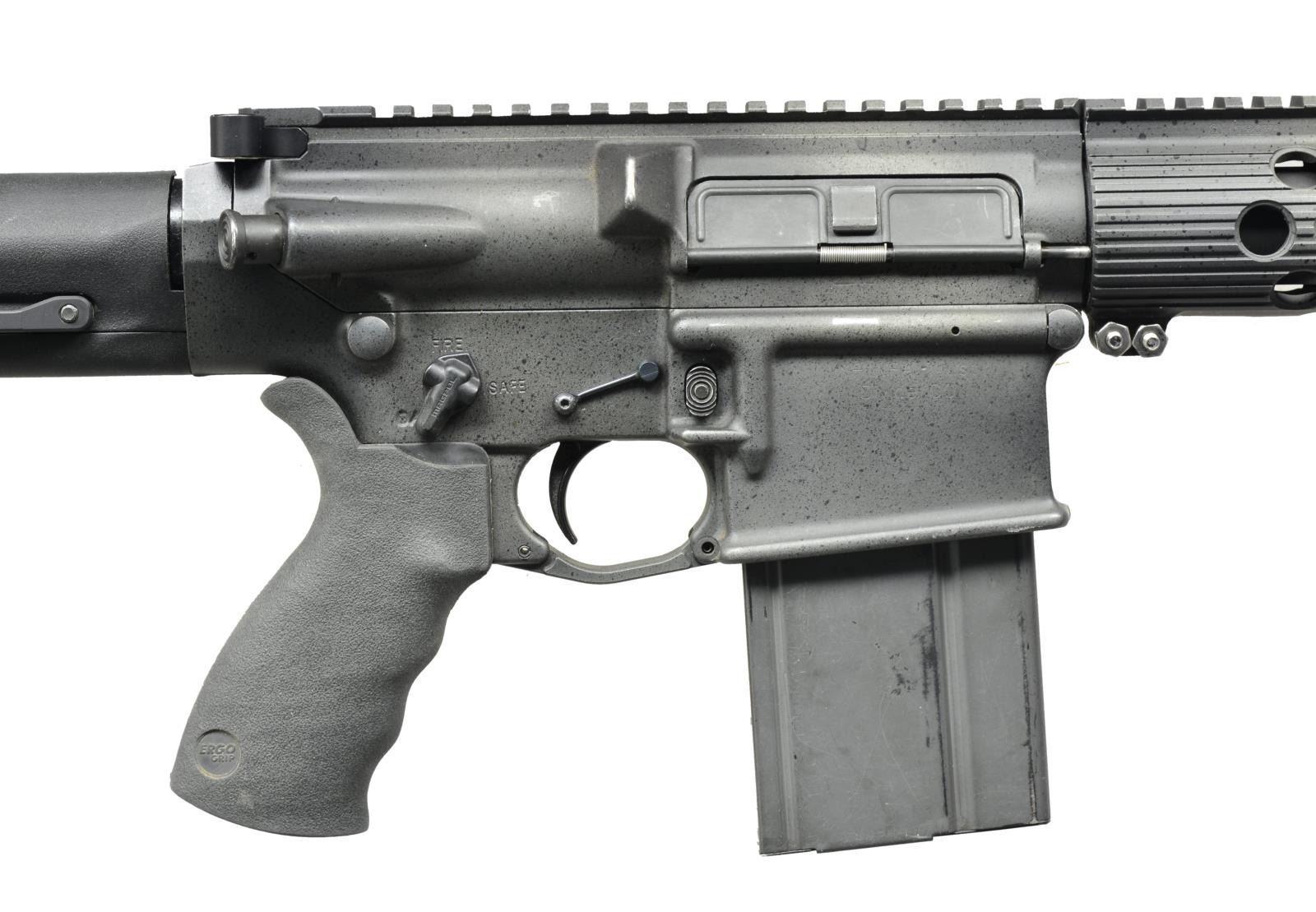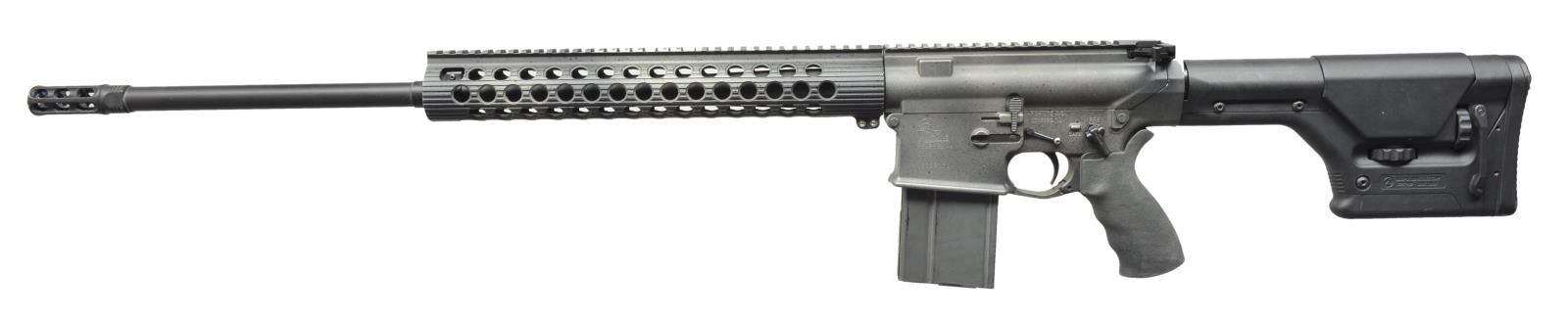 Cal. 7.62x51. S# US323076. Bbl. 24". A customized Armalite AR-10, originally mfg. in Geneseo, IL w/ a heavy 24" bbl. & unique 3" muzzle brake. Left side receiver markings below Armalite logo include “RIFLE 7.62MM”, “AR-10”. Above trigger marked “ArmaLite Inc”, “GENESEO, IL”. Right side mag. well marked: “YE NFA TRUST”, “DIVIDE CO”. Aftermarket lightweight bbl. shroud measures 14" in length w/ the idea of being fully regulated w/ rail on flat top upper receiver, providing over 22" of optic mounting real estate. No sights. Short throw Magpul safety/selector & anti walk trigger pins. Rubber Ergo pistol grip & Magpul PRS clubfoot style stock. BCM Gun Fighter charging handle. Brass deflector & forward assist. MAGS: 1-20 rd. factory. UNATTACHED ACCESSORIES: Plano plastic foam lined transport case. CONDITION: the entirety of receivers & handguard wear a custom speckled finish similar in appearance to stonewash or granite. Free floating handguard experiences considerable flex in movement during handling. 2 Stage trigger is crisp & smooth, appearing to be one of numerous offerings from Geissele. Bore is shiny w/ decent rifling & fire control mechanism appears to function correctly when cycled by hand. (21-763/JZ). MODERN. $800-1,200.