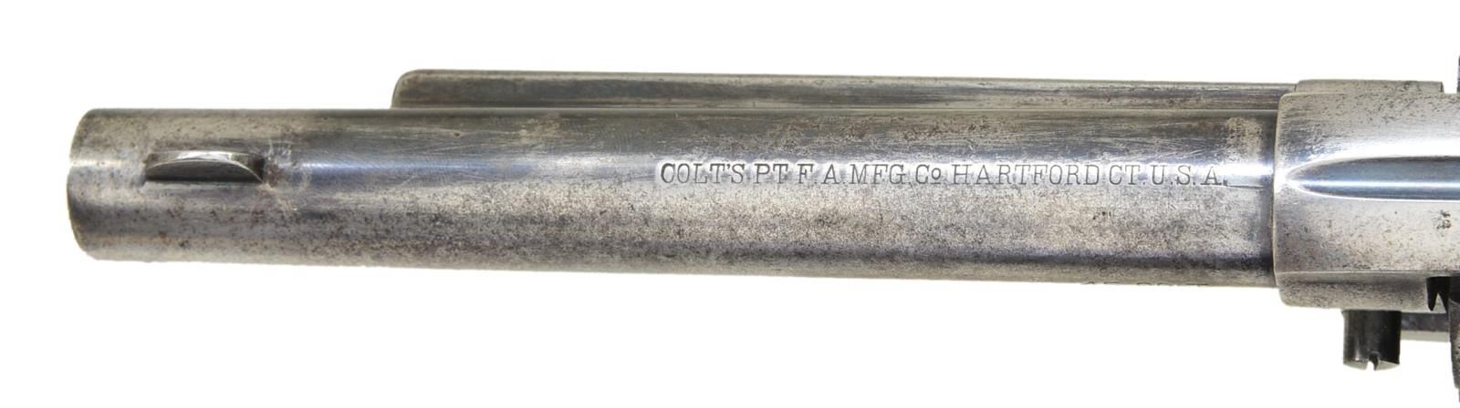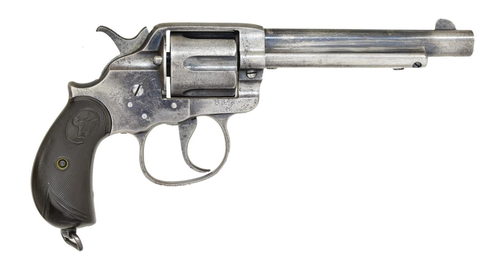 Cal. 45 Colt. S# 44748. Bbl. 6" w/ blade sight. 6 Shot long flute cyl. Blue finish. 2 Piece checkered hard rubber Rampant Colt grips w/ lanyard ring at butt. Unique features are the extra lg. trigger & trigger guard. Right side of frame marked "U.S." w/ "JTT" inspectors mark. Frame & trigger guard have "RAC" inspectors marks on left side. Bbl. has inspectors mark "K" & "P". These revolvers are known by collectors as Alaskan or Phillipine Constabulary models. CONDITION: retains 25% dull fading blue in protected areas w/ balance fading to gray showing handling marks & spots of light pitting. Grips show moderate wear w/ areas of checkering loss. Functioning mechanics. Bore retains lightly worn rifling. (21-43/DS). CURIO. $1,000-1,500.