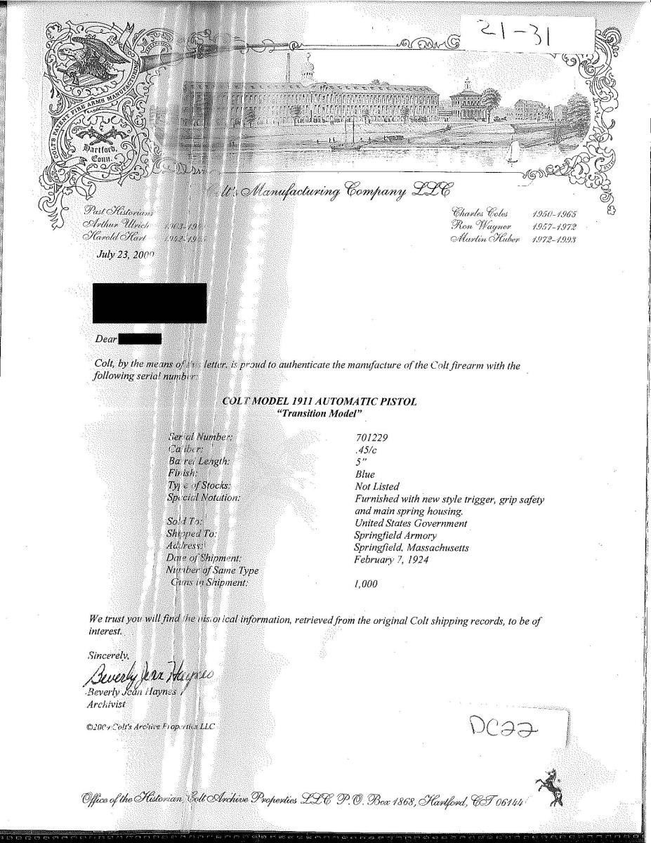 Cal. 45 ACP. S# 701229. Bbl. 5". Shipped Feb. 7, 1924 to Springfield Armory; 1,000 units. Most correct transitional features including: trigger relief cuts, short trigger, long tang safety & coarse checkered Type 3 mainspring housing w/ 27 diamonds (not 32). Checkered thumb safety w/out milled undercut & slide stop w/ milled undercut. Properly marked slide w/ 1911. Frame w/ “WTG” inspection mark. Full checkered walnut grips. Slide matching numbered under firing pin stop. “H” acceptance mark on rear of slide & by disconnector also having “G”. Type 6 bbl. w/ “G” in front of legs; Type 5 normally used 700,000-710,000; Type 6 from 710,000 to end of military production. MAGS: 1 near excellent 2 tone 7 rd. UNATTACHED ACCESSORIES: 2009 dated factory letter. CONDITION: very good plus appearance w/ factory quality refinish appearing commercial rather than Brushed Blue. Very faint inspector initials plus last of S# somewhat faint; very clear slide markings. Noticeable thinning on front strap & slight holster like high point wear on slide. Very good plus grips w/ minimal diamond top wear; very good plus bbl. finish w/ port area having in the white proper finish; very good bore w/ light even frosting. (21-31/NW). CURIO. $1,500-2,200.