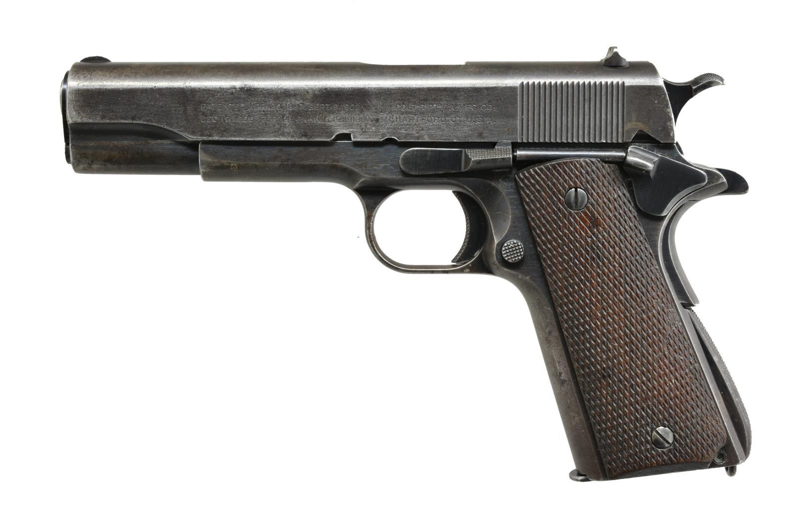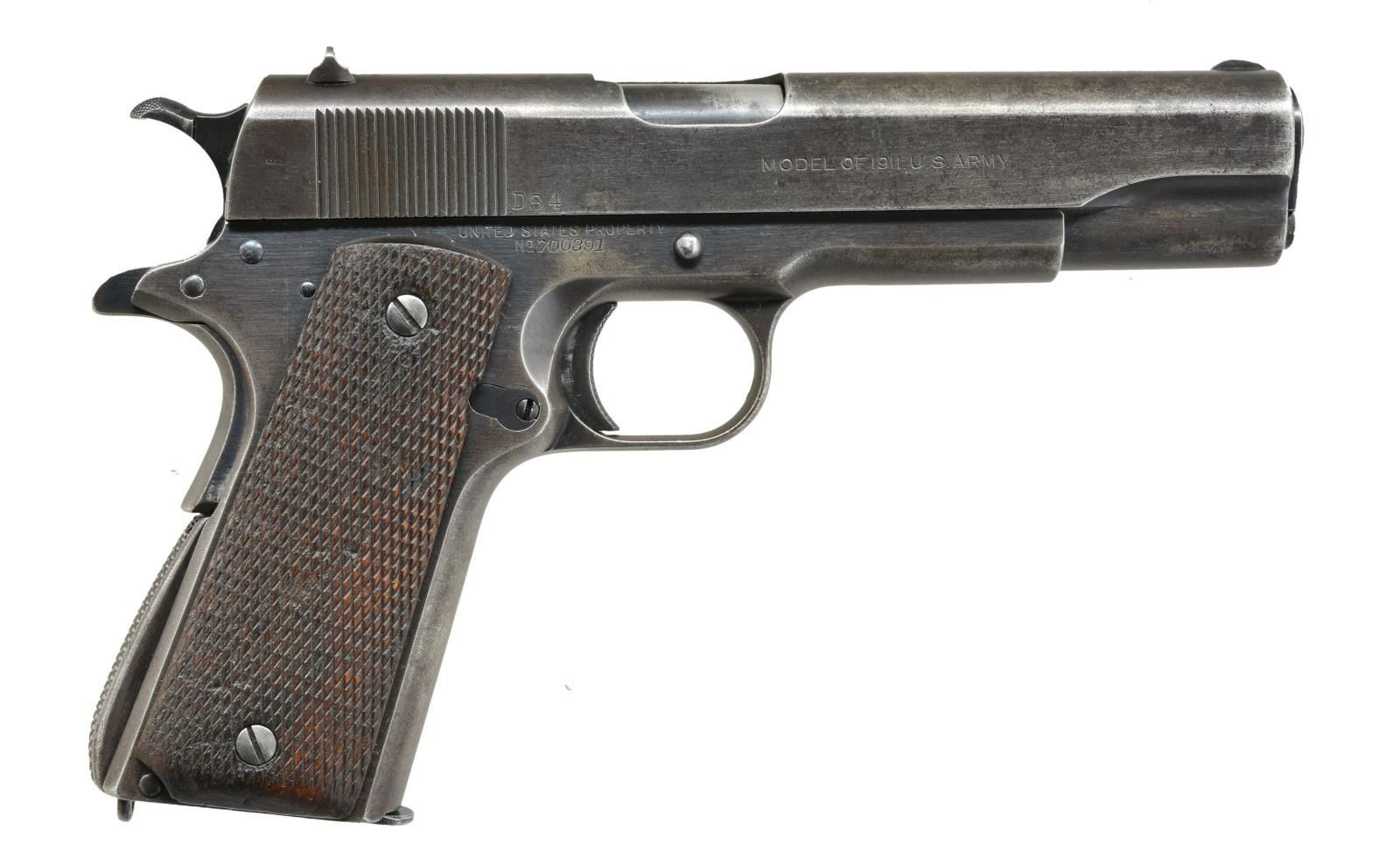 Cal. 45 ACP. S# 700391. Bbl. 5". Shipped Jan. 23, 1924 to Springfield Armory; 1,000 units. Most correct transitional features including: trigger relief cuts, short trigger, long tang safety & coarse checkered Type 3 mainspring housing w/ 27 diamonds (not 32). Checkered thumb safety & slide stop w/out milled undercuts. Properly marked slide w/ 1911; has “D84” forward of cocking grooves on right. Frame w/ “WTG” inspection mark. Full checkered walnut grips. Slide not numbered under firing pin stop. “H” acceptance mark on rear of slide & by disconnector also having “G”; Type 5 bbl. w/ no markings in front of legs. Correct front sight & U-notch rear. MAGS: 1 good unmarked 2 tone 7 rd. UNATTACHED ACCESSORIES: 2018 dated factory letter. CONDITION: good appearance w/ Colt Brushed Blue. Very clear markings throughout. Noticeable thinning on front strap & slight holster like high point wear on slide & dust cover. Thinning finish throughout mixed w/ patina on front strap, pitting on left front edge of trigger guard & areas of cleaned light to peppery oxidation. Light scratch from improper slide stop installation. Good grips w/ diamond top wear; sm. depression on left grip, extra wear at bottom of right & bright worn screws. Worn bbl. finish w/ fair bore having noticeable wear, dark appearance & even pitting throughout. (21-24/NW). CURIO. $1,200-1,800.