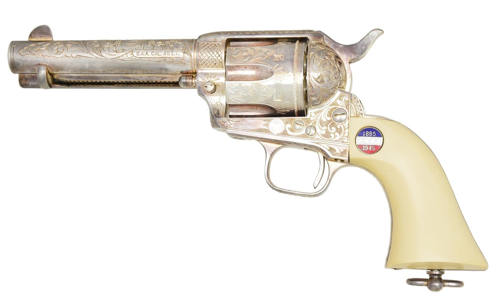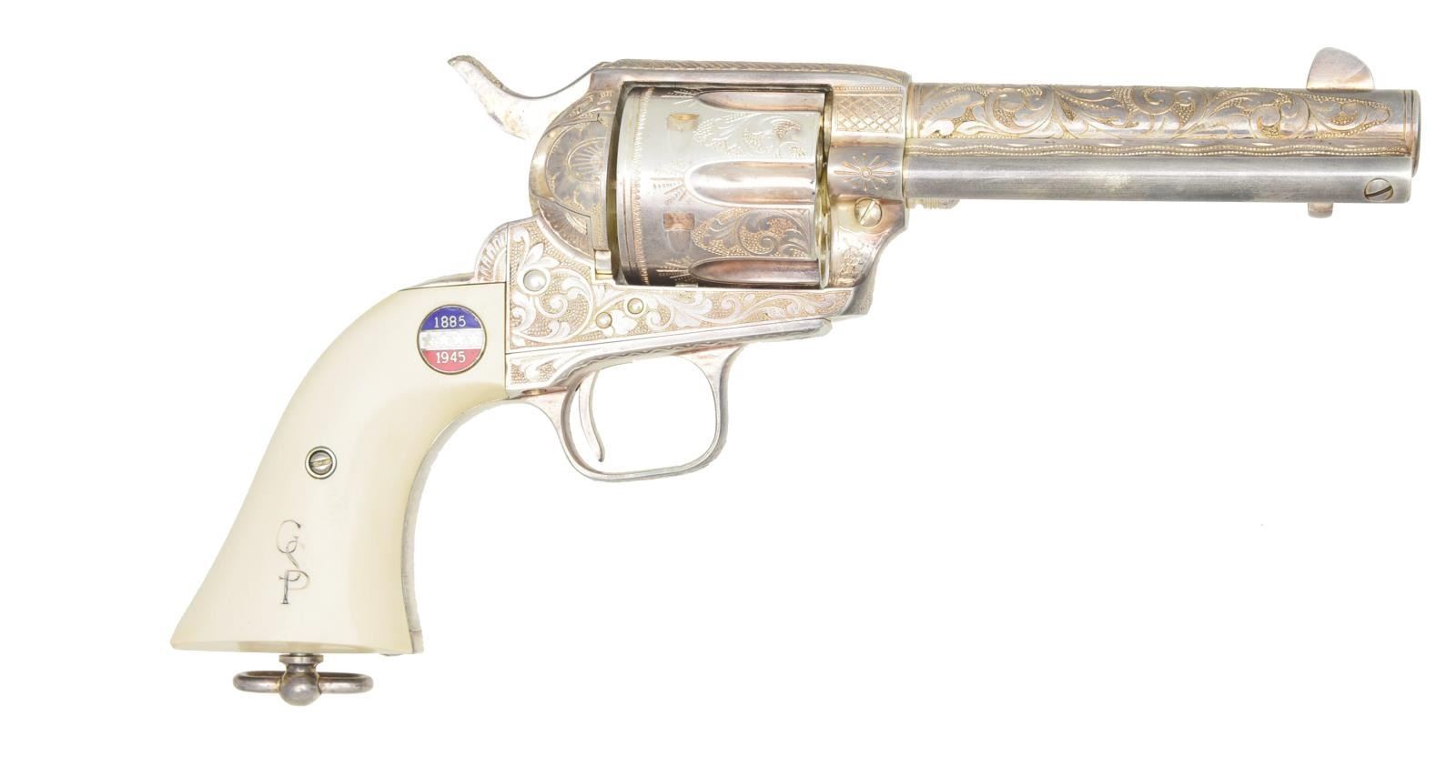 COMMEMORATIVE UBERTI SAA REVOLVER. Cal. 45 Colt. S# P0812. Bbl. 4 3/4" w/ blade front sight. 6 Shot fluted cyl. Bbl. & action have full coverage vine type foliate scroll engraving w/ pearled backgrounds that extend to backstrap, trigger guard & butt. Full nickel finish. Butt has lanyard loop. 1 Piece synthetic ivory grips w/ red, white & blue medallions w/ 4 stars, 1885-1945 dates. Limited edition of 2,500 produced. UNATTACHED ACCESSORIES: American Historical Foundation delivery ticket dated 6-18-92. Original hang tag. Dbl. plexiglass sided walnut display case w/ acrylic suspension peg & blue velour trim. 1 Side of case has four stars at top w/ name plate at bottom marked "GENERAL GEORGE S. PATTEN JR. / NOV. 11, 1885 - DEC. 21, 1945." Case exterior shows scattered scratches & storage marks. CONDITION: gun shows little or no use. Long storage has left the nickel finish w/ a pink hued tarnish on exposed surfaces. Sides of the cyl. that were concealed by the frame have their bright nickel appearance. Very good grips. Bore has a light tarnish over sharp rifling. (21-1522/DS). MODERN. $700-1,000.