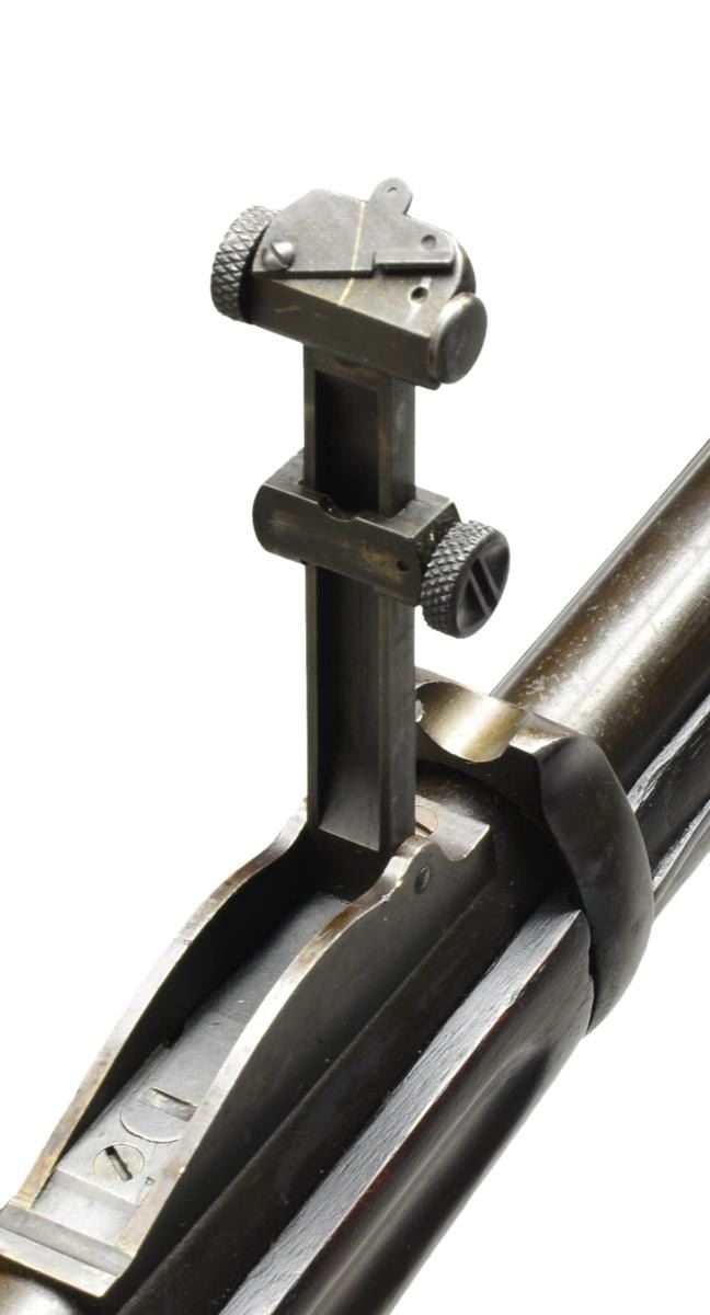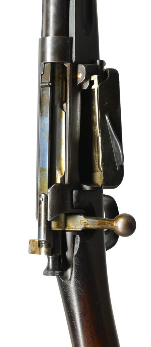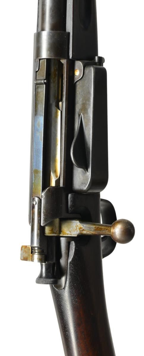 Cal. 30-40 Krag. S# 31032. Bbl. 22". Receiver dated 1896. Correct 1896 stock. Unmarked Model 1902 rear sight w/ sliding peep. Blade front sight. Walnut stock w/ sling bar & saddle ring on left side. Inspectors boxed marking is present but very faint. Encircled script "P" under grip. Correct 1896 type bbl. band. Handguard is not present. CONDITION: stock has pleasing original finish w/ wear, light staining, sm. flecks of white paint notable in toe area. Sm. crack behind receiver tang. Sm. chip of missing wood behind bolt handle seat. Metal has traces of original blue turning patina w/ very light scattered pitting. Bore is shiny but w/ worn lands. Buttplate trapdoor does not seat properly. (01-18794/RW). ANTIQUE. $600-900.