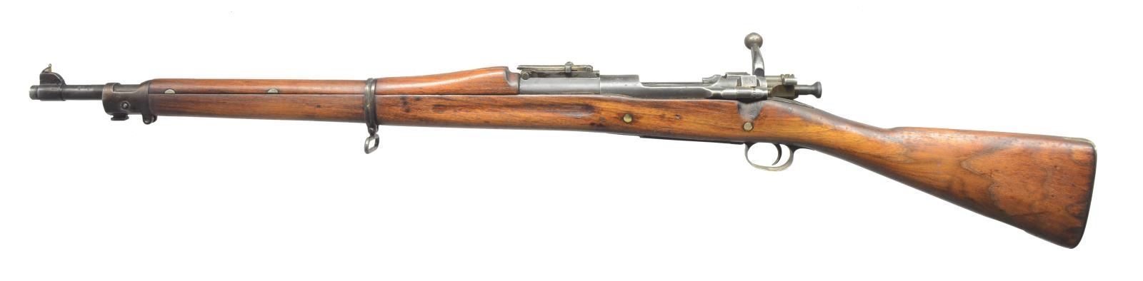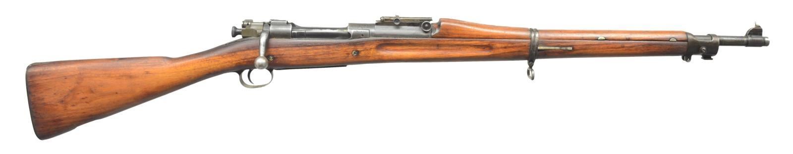 Cal. 30-06. S# 1468850. Bbl. 24" marked behind front sight "SA / flaming bomb / 9-42". Ladder aperture rear sight graduated to 2850 yards w/ volley notch & dished windage & elevation knobs. Sight base is replacement made w/out lightening cuts. Front sight has added amateur gunsmith made aperture for target shooting. Straight down bolt handle. Bolt sleeve is marked "NS" under safety lug & "R". All milled furniture w/ smooth trap buttplate. Stacking swivel & screw are not present. Butt swivel & screws are not present. "S" type walnut stock w/ 2 recoil bolts. Walnut handguard. CONDITION: stock set has been heavily sanded & refinished removing markings & has loss of wood in inletted areas. Stock set has moderate staining & handling marks throughout. Metal has well worn parkerized finish w/ sm. areas of oxidation throughout. Fair bore turning dark, but w/ strong lands. (21-1189/RW). CURIO. $400-600.