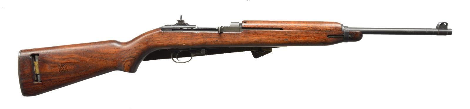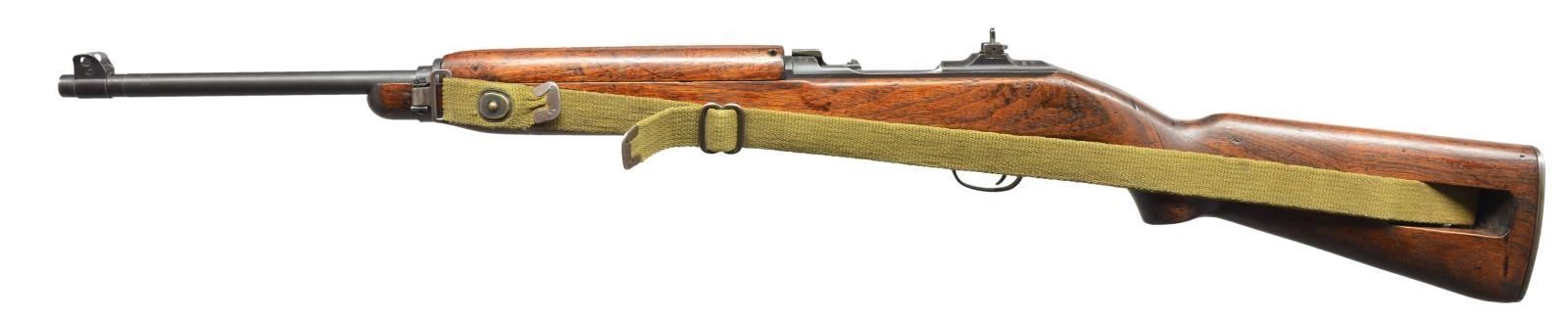 Cal. 30 Carb. S# 190272. Bbl. 18" marked behind front sight "INLAND MFG. DIV. GENERAL MOTORS 1-43". Bbl. has "P" proof. Wide aperture swivel. Bbl. band made w/out bayonet lug. Flip type rear sight marked "S". Front sight w/ protective ears marked "N". Straight cut slide marked "PI". Flat bolt marked "AI". Milled trigger guard marked "INLAND". Push button safety. Mag. release marked "WI". Dog leg hammer marked "I" in shield. High wood T slot walnut stock marked "IO" & flaming bomb in sling slot w/ additionally bored GI twin triangles. Bottom of grip has circle "P" proof encompassed by bored GI outline. Buttstock marked on right side w/ crossed cannons. 2 Rivet handguard marked "IO" w/ early lg. groove. Green web sling. MAGS: none. CONDITION: stock set has arsenal rework type finish w/ added finish over scattered dents & handling marks leaving stock markings visible. Metal has 75% original parkerized finish w/ light wear & thinning. Very good shiny bore w/ sharp lands. (21-1421/RW). CURIO. $600-900.