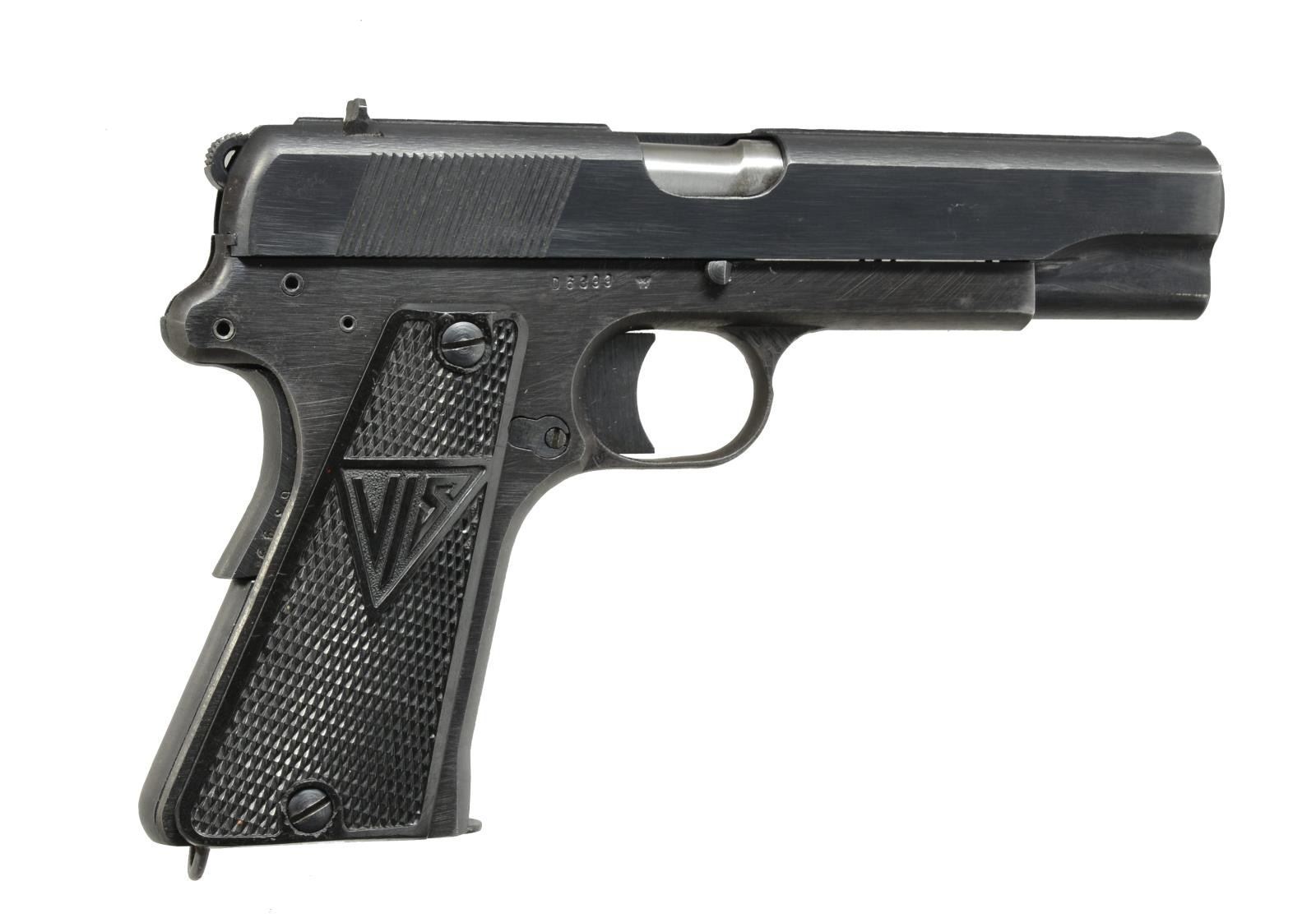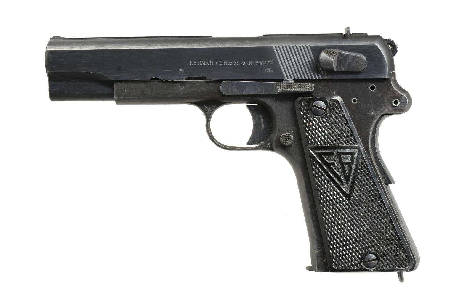 Cal. 9mm Luger. S# D6399. Bbl. 4 3/4". Type III w/ 2 levers & no stock slot having salt blued finish w/ traces of milling marks. Matching numbers on frame, slide, bbl. & grip safety. German proofs of eagle "77" on slide & frame; bbl. w/ eagle "623". Checkered black plastic grips w/ "FB" on left & "VIS" on right; lg. head grip screws. MAGS: 1 very good 8 rd. w/ rub marks caused by mag. latch & top right grip screw. CONDITION: very good plus appearance w/ minimal high point wear. Grip screws left somewhat loose to allow mag. clearance. Good plus bore w/ traces of very light pitting. (21-1344/NW). CURIO. $650-900.