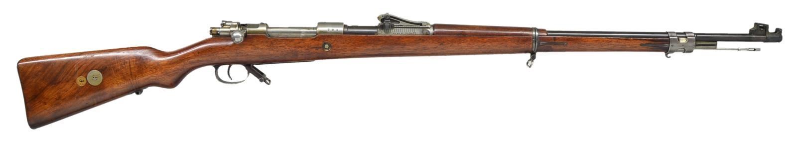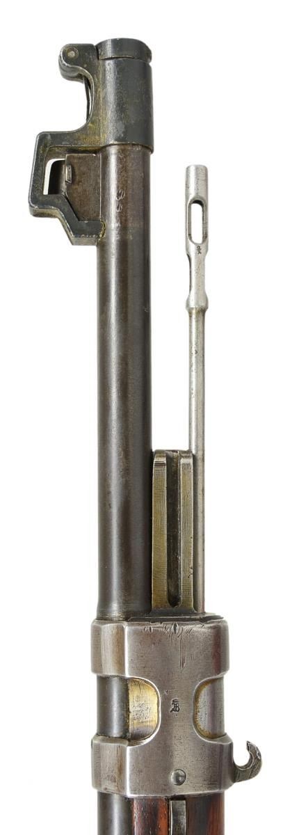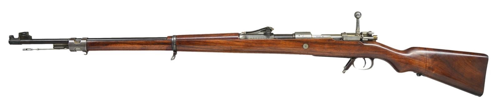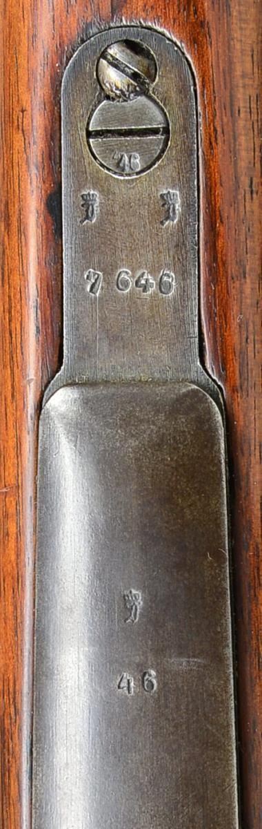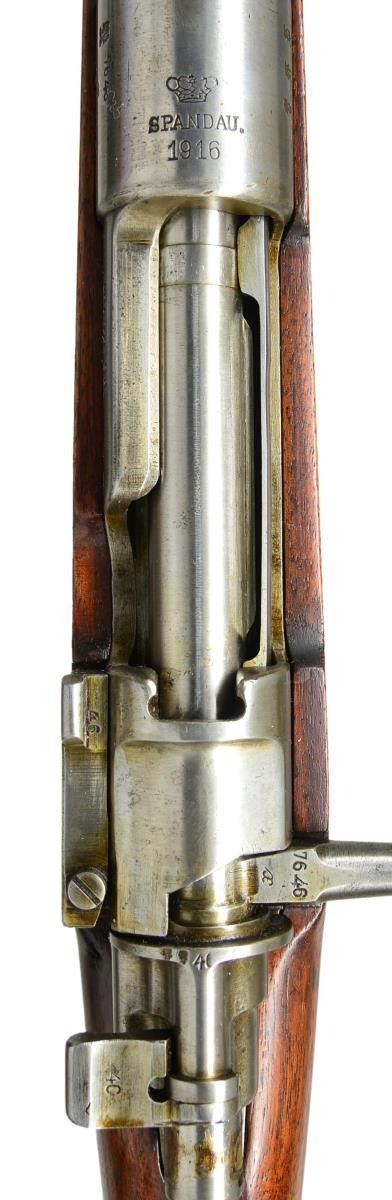 Cal. 8mm Mauser. S# 7646. Bbl. 29 3/4". Nice, professionally restored WWI infantry rifle w/ all matching numbers complete w/ detachable butt swivel. Bright receiver marked on left rail in gothic Gew. 98. Receiver ring marked on top w/ imperial crown & "SPANDAU" "1916". Imperial proofs on right side of receiver ring. Bbl. marked on top w/ "S". Straight bolt handle. Lange rear sight graduated to 2000m. Inverted "V" front sight. Cleaning rod w/ dbl. slotted head is present. Bayonet bar is present. Upper band has parade hook. Walnut stock set. Buttstock has unmarked marking disk in right side. UNATTACHED ACCESSORIES: front sight protector w/ hinged muzzle cap. CONDITION: buttstock has had finish restored w/ good appearance & scattered, light handling marks w/ slight loss of wood in inletted areas. Metal has 80% original blue finish w/ thinning & light wear. Bore has strong lands, but slight frosted appearance. (21-1632/RW). CURIO. $1,000-1,600.