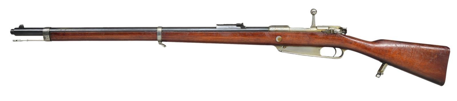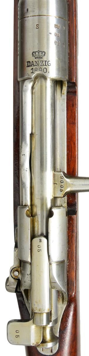 Cal. 8mm Mauser. S# 9005. Bbl. 29 1/4". All visible numbers match. Rifle mfg. at Danzig Arsenal was given 1905 conversion to utilize standard Mauser stripper clips in place of the original en bloc clip. Receiver bridge modified by riveted on clip guards. Receiver ring has clearance cut for bullet tips. Left rail has been given shallow thumb slot. Left mag. wall has spring loaded cartridge retainer. Clip release has been removed & plated over in trigger guard. Rifle does not have mag. opening cover. Left receiver rail marked in gothic "Gew 88." Receiver ring marked on top w/ "imperial crown" "DANZIG 1890 S." Receiver ring marked on right side w/ imperial proofs "SJ?" Ladder rear sight graduated to 2000m. Inverted "V" front sight. Double slotted cleaning rod. Upper band w/ bayonet lug marked "8. R. J. 3.139.". Lower band has crossed out unit markings. Walnut stock. Stock markings have been rendered obscure due to professional refinish. CONDITION: stock has added coat of lacquer as preservative w/ wear, flaking & scratches. Receiver, trigger guard, bolt & furniture are bright w/ light wear & staining. Bbl. jacket has original blue w/ thinning wear & scattered areas of fine pitting. Bore is shiny w/ strong lands. (01-19374/RW). ANTIQUE. $400-600.