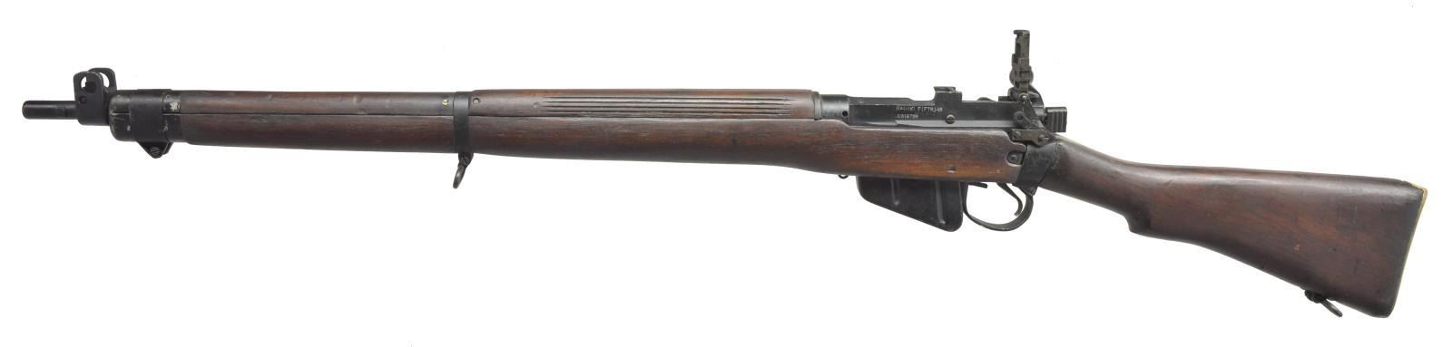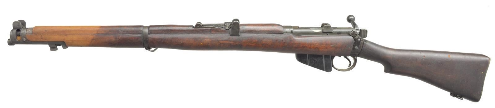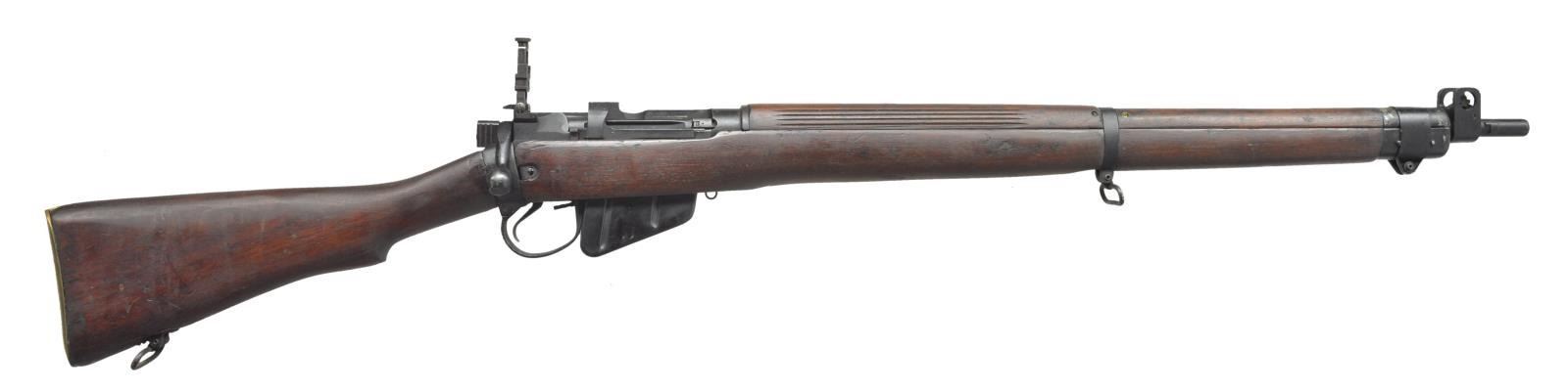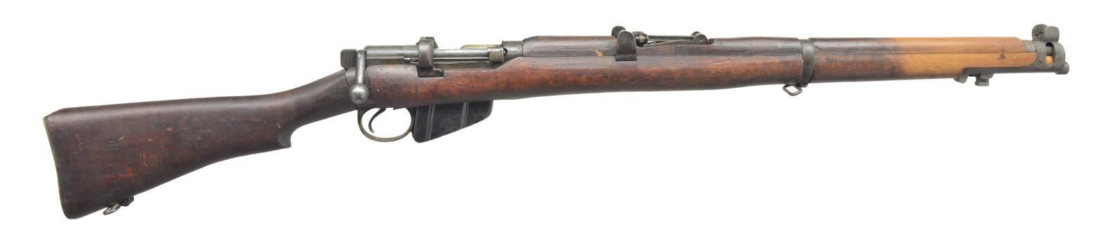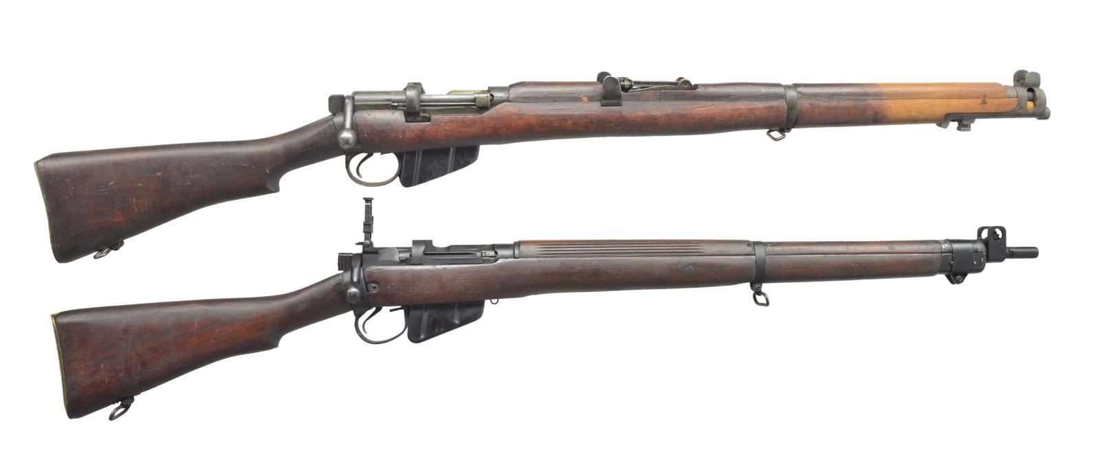 II BOLT ACTION RIFLES. BOTH: cal. 303 British. Bbls. 25 1/4". 1) LITHGOW SMLE III*. S# 90046. All visible numbers match. Import mark on right side of clip guide. Butt socket marked on right side "MA LITHGOW S.M.L.E. III* 1942". Receiver ring has view marks on left side. Tangent rear sight graduated to 2,000 yards. Blade front sight. Nose cap has bayonet lug & protective ears. Matching Australian hardwood stock set. Buttstock marked on right side "MA LITHGOW S.M.L.E. III* HV 1942" & "8-44". MAGS: 1 detachable 10 rd. CONDITION: stock set has moderate wear, staining & scratches. Markings on buttstock are crisp. Handguard & forend have had finished removed for approx. 8" behind front sight. Metal has 75% original finish w/ light wear, scratches & handling marks. Buttstock is slightly loose to socket. Near excellent shiny bore. (21-1172/DS). 2) ENFIELD NO. 4 MARK I. S# BW19798. Numbers match on receiver, bolt, mag. & forend. Import marked on right side of butt socket. Left side of receiver stamped "N-4. MK 1" additionally electro penciled "NO 4 MK I F (FTR) 48" indicating factory thorough repair at Fazakarley arsenal in 1948. Left side of receiver ring has export marks. Adj. ladder aperture graduated to 1300 yds. Blade front sight w/ protective ears. Matching walnut stock set w/ grooved rear handguard & brass trap buttplate. MAGS: 1 detachable 10 rd. CONDITION: stock set has light to moderate wear, staining & handling marks including deep scratch on right side of buttstock extending from middle of grip nearly to butt swivel. Metal has 75% black arsenal rework finish w/ light wear & flaking, notable loss of finish at tips of handguard & forend. Near excellent shiny bore. (21-1177/RW). ALL CURIO. $500-700.