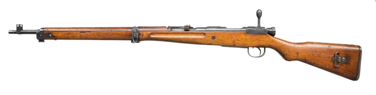 Cal. 7.7 Jap. S# 56106. Bbl. 25 1/2". All visible numbers match. Ladder aperture rear sight graduated to 1500m. A/A wings are not present. Inverted "V" front sight w/ protective ears. Receiver marked on left rail w/ Nagoya Arsenal marking. Receiver ring has ground mum leaving "Type 99" characters. Oval bolt knob. Notched, checkered safety knob. Cleaning rod is not present. 3 screw upper band w/ bayonet lug. Lower band has provision for monopod which is not present. Hardwood stock set w/ long handguard. Small, recoil bolt. 2 screw butt swivel. Cup type buttplate. CONDITION: stock set has moderate wear, dents, staining & scratches throughout. Metal has 60% blue w/ thinning & wear & areas of oxidation & moderate pitting notable on receiver ring & bridge. Very good, shiny bore. (21-1670/RW). CURIO. $300-500.