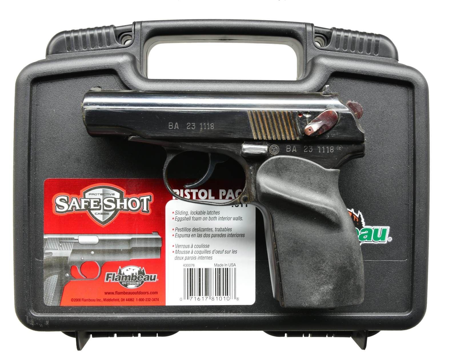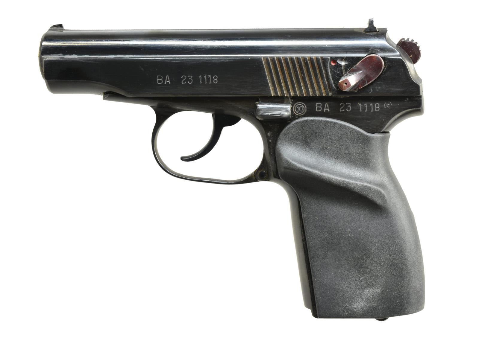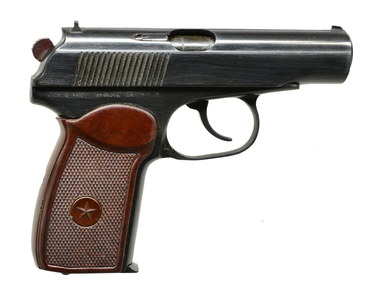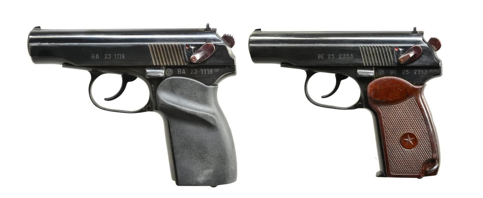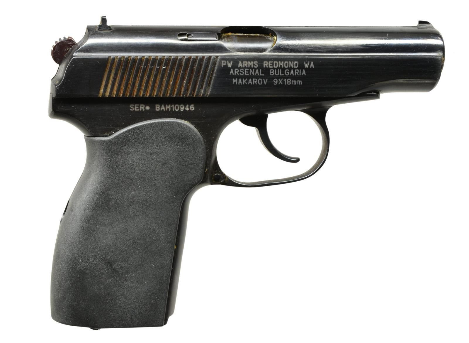 1) Cal. 9x18 MAK. S# BAM10946. Bbl. 3 3/4", import marked on right side of slide. Fixed sights. SA/DA. Frame marked on left side w/ encircled "10" indicating Bulgarian manufacture. Frame & slide have original matching S#s BA23 1118. Right side of frame has importer S# . Right side of slide marked "PW ARMS REDMOND WA ARSENAL BULGARIA MAKAROV 9X18mm". 1-Piece grips are smooth, black composite w/ thumbrest. MAGS: 1-8 rd. UNATTACHED ACCESSORIES: original brown checkered composite 1-piece grip, & plastic carrying case. CONDITION: original grips have moderate wear, scratches, & flattening of diamonds. Replacement grips in very good condition. 90% Arsenal rework blued finish w/ light high point wear. Very good shiny bore. (21-806/RW). 2) Cal. 9x18 MAK. S# BE252353. Bbl. 3 3/4", import marked on right side of frame. Fixed sights. SA/DA. Frame marked on left side w/ encircled "10" indicating Bulgarian manufacture. S#s match on frame & slide. Frame marked on right side "PW ARMS Redmond, WA 9x18". 1-Piece brown composite checkered grips w/ stars. MAGS: 2 matching 8 rd. UNATTACHED ACCESSORIES: cardboard shipping box. CONDITION: grips have very light wear & scattered flattened diamonds. Metal has 90% arsenal rework blue w/ light high point wear. Near excellent shiny bore. (21-823/RW). BOTH MODERN. $300-700.