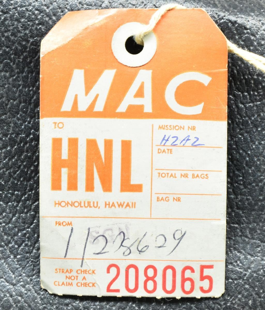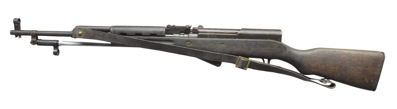 RIFLE WITH PAPERS. Cal. 7.62x39. S# 11278629. Bbl. 20 1/2". All visible numbers match. Rifle was documented in Oct. 1971 as War Trophy & brought back to Hawaii in included black pebbled grained case. Receiver marked on left side w/ triangle "26" & 3 Chinese characters. Tangent rear sight graduated to 1000m. Post front sight w/ protective hood. Cleaning rod is not present. Replacement 12 1/8" spike bayonet along w/ improper replacement bayonet attaching screw. Hardwood stock set. Cleaning kit in butt. Period leather sling w/ brass buckle. UNATTACHED ACCESSORIES: black pebble grained gun case that has "MAC" flight tag. Envelope containing War Trophy papers. CONDITION: stock set has heavily worn appearance w/ dents & scratches. Dark stained finish. Crack in top of buttstock at heel & back of receiver tang. Metal has traces of blue turning overall patina w/ areas of oxidation & fine pitting throughout. Replacement bayonet has notably more blue finish. Very good shiny bore. (21-1439/RW). CURIO. $600-900.