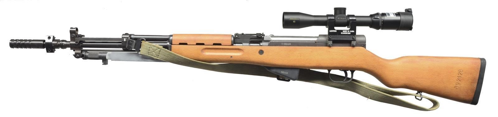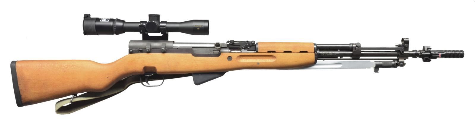 RIFLE. Cal. 7.62x39. S# V-692426. Bbl. 24" including grenade launcher w/ import marks on right side. All visible numbers match. Yugoslavian made SKS type rifle mfg. by Zastava in 1985 w/ integral grenade launcher. Bbl. fitted w/ laser pointer. Tangent rear sight graduated to 1,000m w/ green enhancement & sight notch. Post front sight w/ protective hood. Folding front night sight. Folding grenade launching sight graduated to 270m. Receiver cover made for side scope mt. Leapers (China) side mts. holding Nikon Monarch 2x-8x BDC scope w/ long range reticle. Cleaning rod is present. Folding 10 1/4" fullered blade bayonet. Hardwood stock set w/ rubber recoil pad. Cleaning kit in butt. Green web sling. UNATTACHED ACCESSORIES: aftermarket blued steel 30 rd. mag. w/ front extension. CONDITION: stock set has attractive appearance w/ very light wear & scattered handling marks. Metal has 90% original finish w/ light high point wear. Near excellent. (21-1459/RW). MODERN. $300-500.