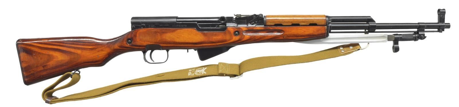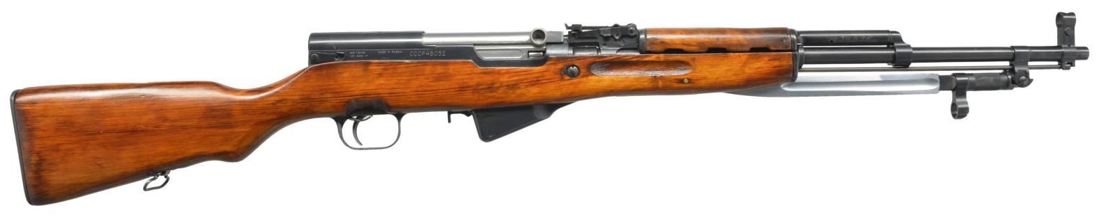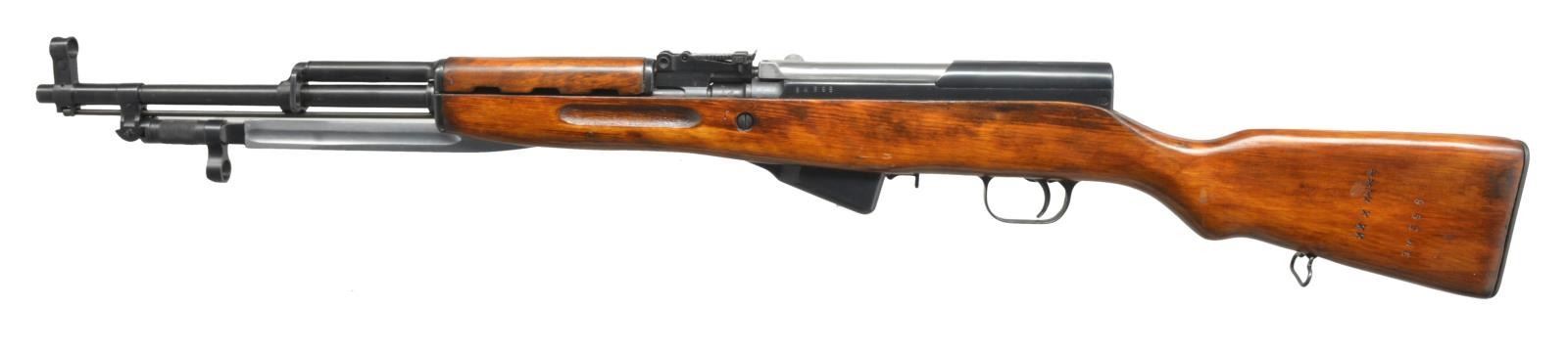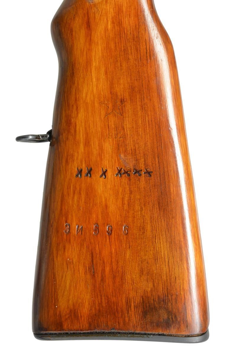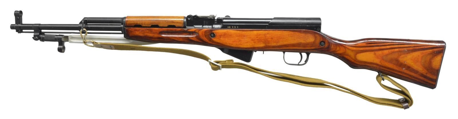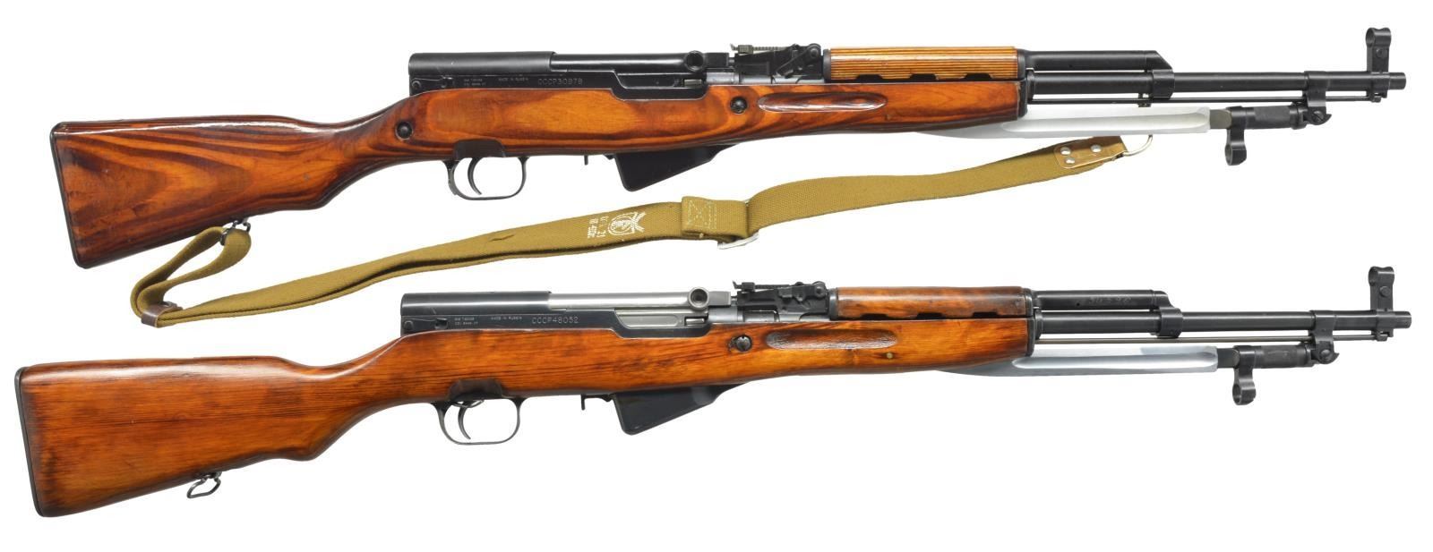 1) Cal. 7.62x39. S# CCCP30979 Import marked on right side of receiver. Given new S#. Original S# MN956 matches on receiver stock bolt & trigger guard. Bbl. 20 5/8". Top cover marked w/ arrow & star indicating mfg. at Tula Arsenal, dated 1951. Tangent rear sight graduated to 1000m. Post front sight w/ protective hood. Cleaning rod is present. 9 & 1/2" Fullered blade folding bayonet. Laminated stock set. Stock has additional recoil bolt below rear of receiver. Cleaning kit in butt. Brown web sling. CONDITION: very good arsenal rework finish on wood & metal w/ very light handling marks. Good bore w/ lightly worn lands. (21-515/RW). 2) Cal. 7.62x39. S# CCCP48052. Import marked on right side of receiver. Original S# 3 in 596 matches on receiver, bolt, trigger group & buttstock. Bbl. 20 1/2". Receiver marked on top w/ arrow in star indicating mfg. at Tula Arsenal, dated 1952. Tangent rear sight graduated to 1000m. Post front sight w/ protective hood. Cleaning rod is present. 9 3/8" Fullered blade folding bayonet. Hardwood stock set. Cleaning kit in butt. Buttstock has series of sm. x's stamped in left side. CONDITION: wood & metal have arsenal rework finish w/ very good appearance, stock has very light wear & scattered handling marks. Near excellent shiny bore. (21-516/RW). BOTH CURIO. $800-1,200.