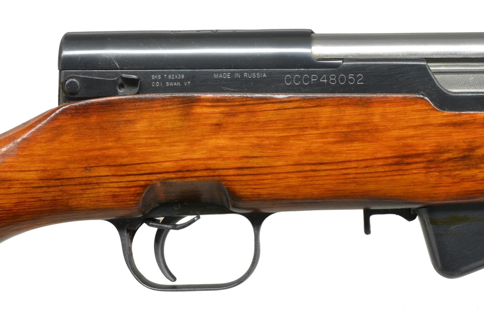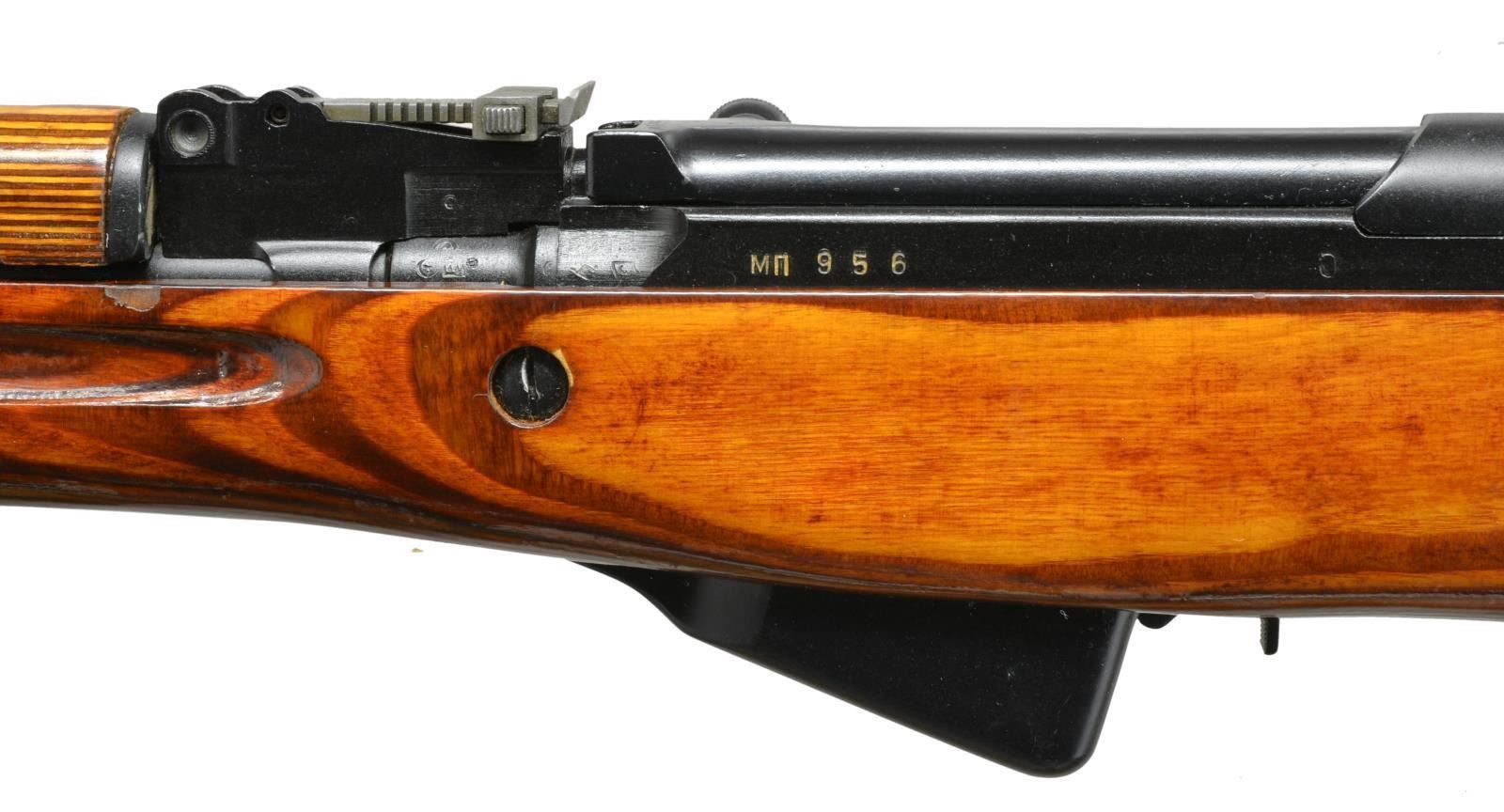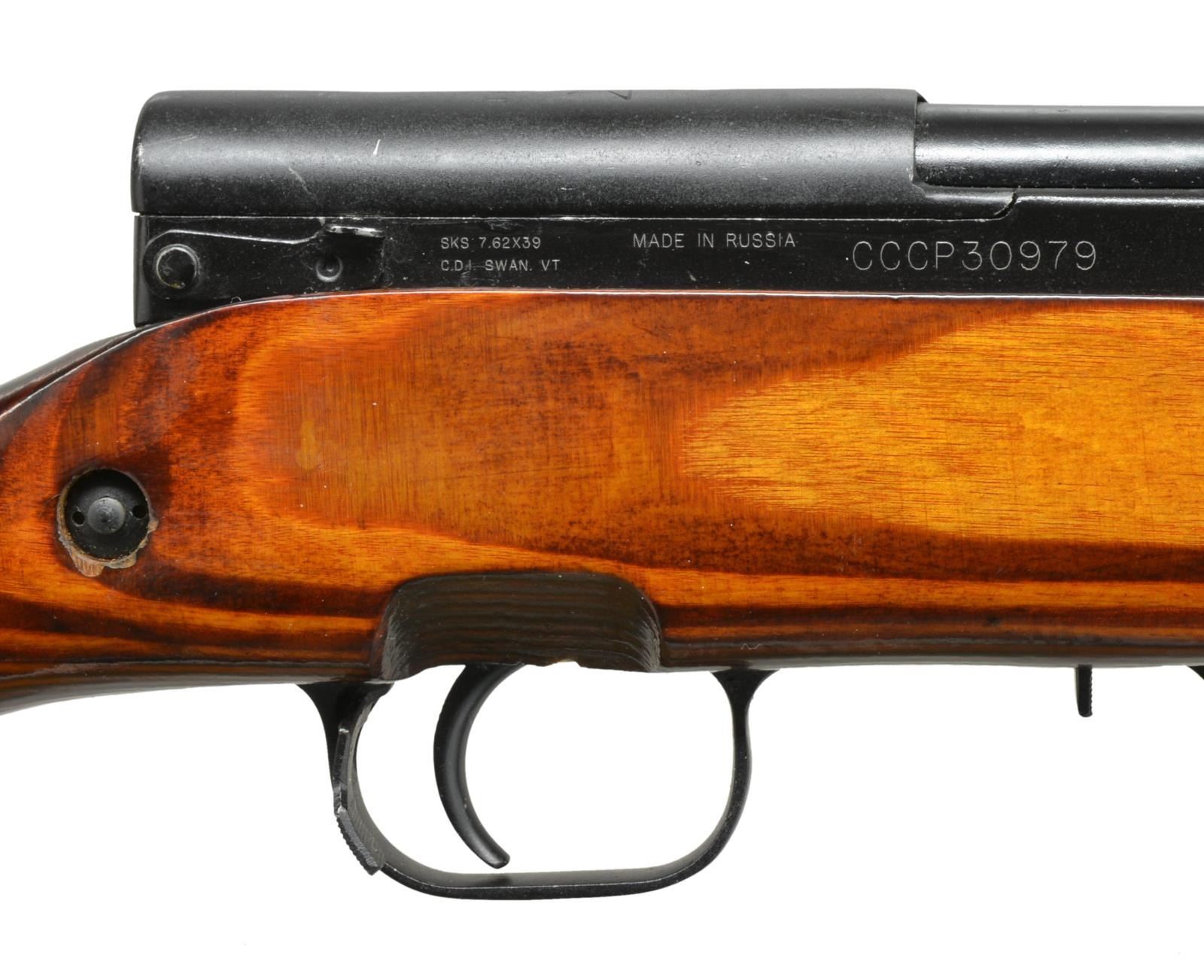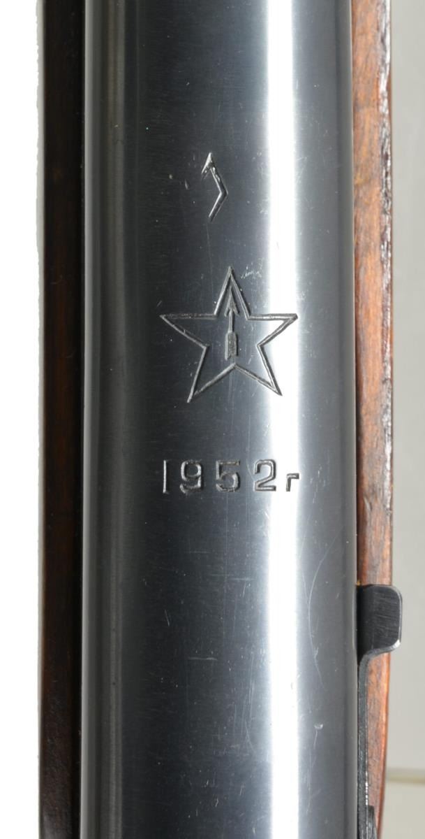 1) Cal. 7.62x39. S# CCCP30979 Import marked on right side of receiver. Given new S#. Original S# MN956 matches on receiver stock bolt & trigger guard. Bbl. 20 5/8". Top cover marked w/ arrow & star indicating mfg. at Tula Arsenal, dated 1951. Tangent rear sight graduated to 1000m. Post front sight w/ protective hood. Cleaning rod is present. 9 & 1/2" Fullered blade folding bayonet. Laminated stock set. Stock has additional recoil bolt below rear of receiver. Cleaning kit in butt. Brown web sling. CONDITION: very good arsenal rework finish on wood & metal w/ very light handling marks. Good bore w/ lightly worn lands. (21-515/RW). 2) Cal. 7.62x39. S# CCCP48052. Import marked on right side of receiver. Original S# 3 in 596 matches on receiver, bolt, trigger group & buttstock. Bbl. 20 1/2". Receiver marked on top w/ arrow in star indicating mfg. at Tula Arsenal, dated 1952. Tangent rear sight graduated to 1000m. Post front sight w/ protective hood. Cleaning rod is present. 9 3/8" Fullered blade folding bayonet. Hardwood stock set. Cleaning kit in butt. Buttstock has series of sm. x's stamped in left side. CONDITION: wood & metal have arsenal rework finish w/ very good appearance, stock has very light wear & scattered handling marks. Near excellent shiny bore. (21-516/RW). BOTH CURIO. $800-1,200.