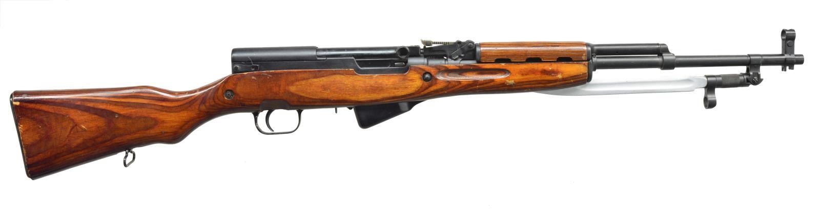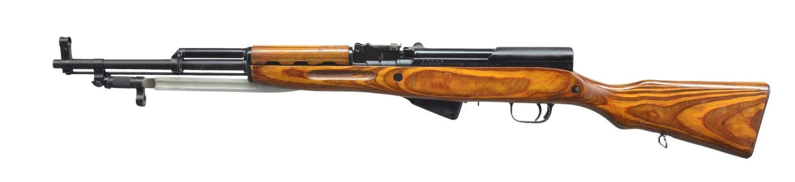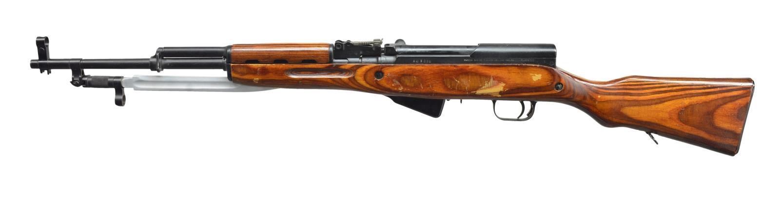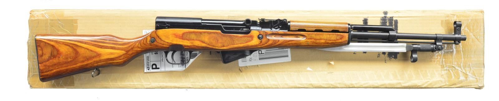 1) Cal. 7.62x39. S# RL008322. Bbl. 20 5/8". All visible original serial #'s match. Receiver has import marks on left side. Receiver cover marked w/ arrow in star indicates mfg. at Tula Arsenal. 1952 Date. Tangent rear sight graduated to 1000 m. Post front sight w/ protective hood. Cleaning rod is not present. 9 3/8" Folding fullered blade bayonet. Laminated hardwood stock set. Cleaning kit in butt. CONDITION: stock has 70% original finish w/ flaking, wear & handling marks. Flaking is notable on left side above trigger guard. Metal has 90% arsenal rework finish w/ light high point wear. Very good shiny bore. (21-752/RW). 2) Cal. 7.62x39. S# 20765. Bbl. 20 1/2". Original S#. matches on receiver, bolt, trigger guard & buttstock. Receiver import marked on left side. Receiver cover has arrow in star indicating mfg. at Tula Arsenal. Dated 1951. Tangent rear sight graduated to 1000m. Post front sight w/ protective hood. Cleaning rod is present. 9 3/8" Folding fullered blade bayonet. Laminated hardwood stock set. UNATTACHED ACCESSORIES: matching cardboard shipping box contains gun safety lock. Spare bayonet blade. Green web sling. CONDITION: stock set & metal have very lg. degree of attractive arsenal rework finish w/ very light wear & scattered handling marks. Very good shiny bore. (21-765/RW). BOTH CURIO. $800-1,200.