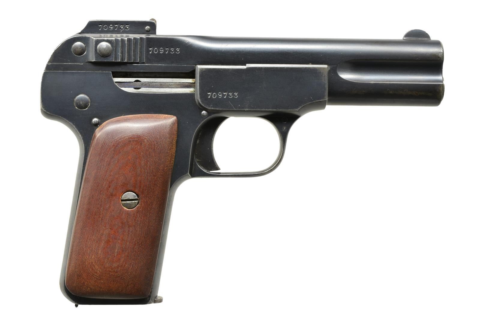 Cal. 7.65mm (32 ACP). S# 709733. Bbl. 4" positioned below recoil spring assembly. Mfg. 1900-1914 (724,500 units) w/ numerous Belgian proofs along w/ "Browning's Patent" marking & safety positions in French. Matching numbered frame, slide & rear sight. Smooth well made walnut replacement grips. MAGS: 1 good to very good FN marked blued 7 rd. UNATTACHED ACCESSORIES: generic storage box. CONDITION: very good overall appearance w/ minimal high point wear plus gray tone on front portion of bbl. & light plier marks around circumference. Very good grips w/ slightly less than factory workmanship around screws. Near excellent bore. (21-987/NW). CURIO. $650-900.