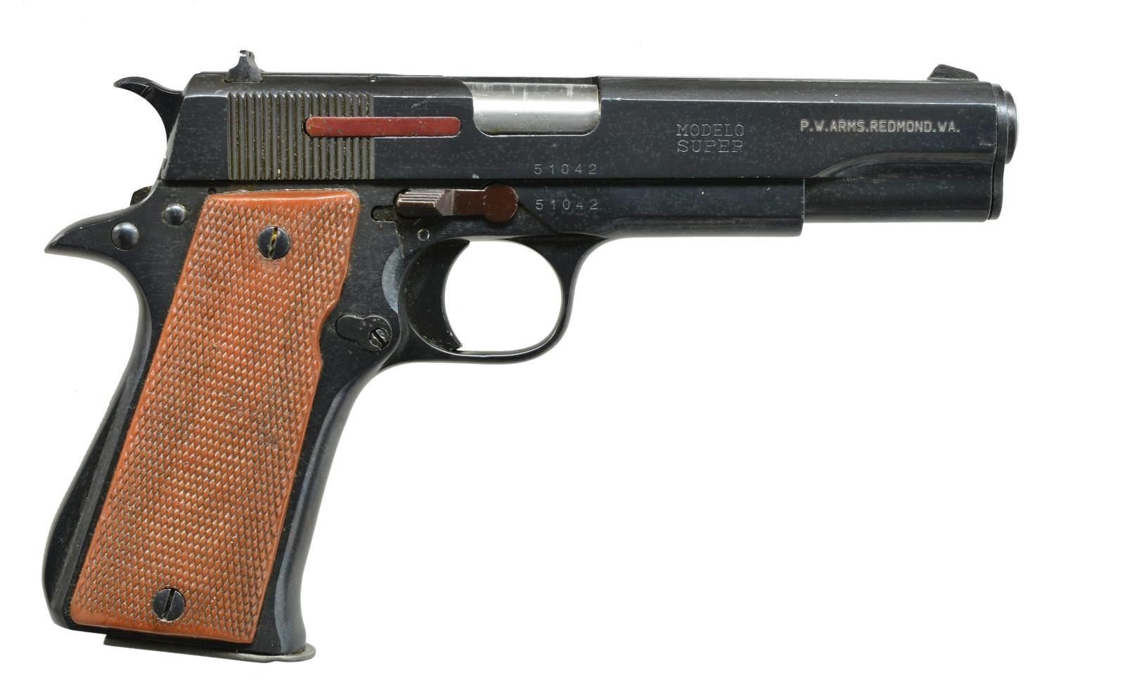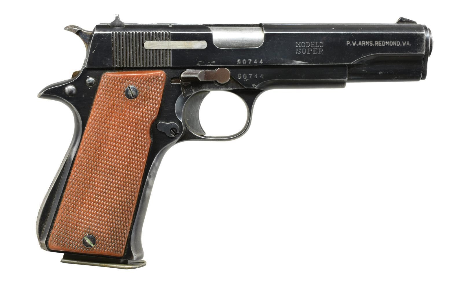 BOTH: cal. 9mm P. Bbls. 5". Ramp front sights w/ square notch rear sights. Checkered plastic grips. Both trigger guards stamped "72" indicating 1972 mfg. 1) S# 1236688. Right side of slide & frame have number "51042" MAGS: 2 detachable 8 rd. UNATTACHED ACCESSORIES: 1 piece box w/ mismatched label containing instruction manual, cleaning rod, & spare mag. CONDITION: over 90% brightly polished reblued finish showing lg. areas of spotted finish loss or fading. Right hand slide lock & extractor have plum color from reblue. Grips show substantial checkering wear & handling marks. Bore is bright w/ strong rifling. (21-785/DS). 2) S# 1236390. Right side of slide & frame have number "50744". MAGS: 2 detachable 8 rd. UNATTACHED ACCESSORIES: 1 piece box w/ proper model label having incorrect S#. Box contains instruction manual & spare mag. CONDITION: 70% dull blue showing edge & carry wear. Grips show moderate checkering wear. Bore is bright w/ strong rifling. (21-786/DS). ALL MODERN. $600-900.